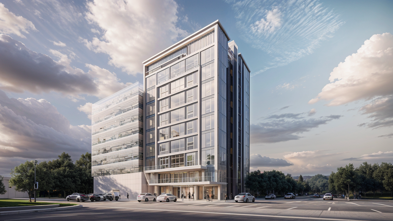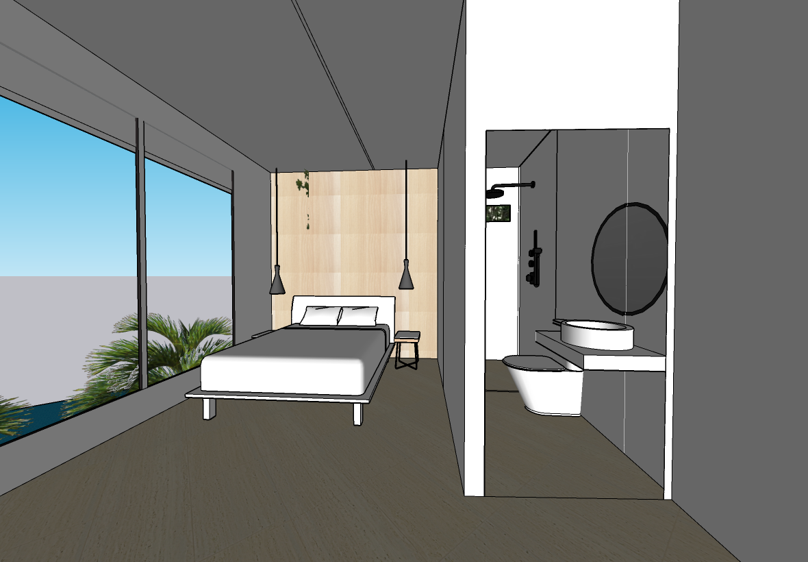 exterior shot render a modern minimalist bedroom connected to a bathroom use a soft white for the ceiling and left wall with large floor to ceiling windows showcasing a vivid blue sky and lush green palm trees and an ocean view on horizon the light oak floor should be a shiny tile the accent wall behind the bed should be a light beige wood panel with delicate hanging plants include a sleek white bed with soft white bedsheets and two black pendant lights on either side the bathroom should have a matte gray wall with a white circular sink and toilet and a round black framed mirror create a serene and calming atmosphere with natural light flooding the room