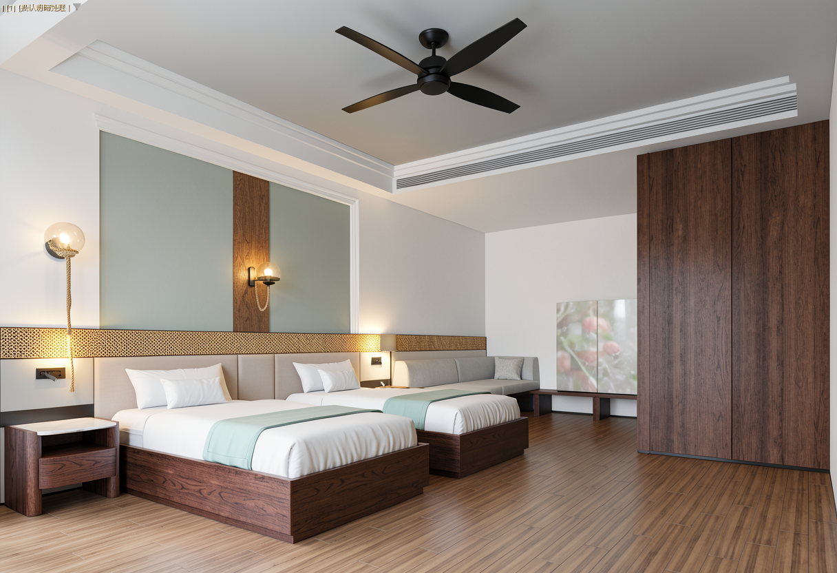 photorealistic render of a resort hotel room interior featuring two dark wood bed frame with crisp white linens and soft teal colour linen bed runners the walls are painted a soft calming white with a feature wall in a muted soft teal colour for contrast a long natural tone wicker texture headboard stretches the length of the room providing a warm atmosphere the floor is a dark wood tone complementing the rich wood of the beds and side tables the minimalist ceiling has a sleek modern design painted in a soft white ambient lighting is soft and inviting with a modern tinted glass sphere wall sconce with rope detail above and in between the beds a large wooden wardrobe with see through vertical slats stands elegantly to the side along with a contemporary minibar cabinet in mother of pearl mosic finish in the centre of the ceiling is a black ceiling fan to add to the resort them the atmosphere is serene and calm exuding both comfort and style