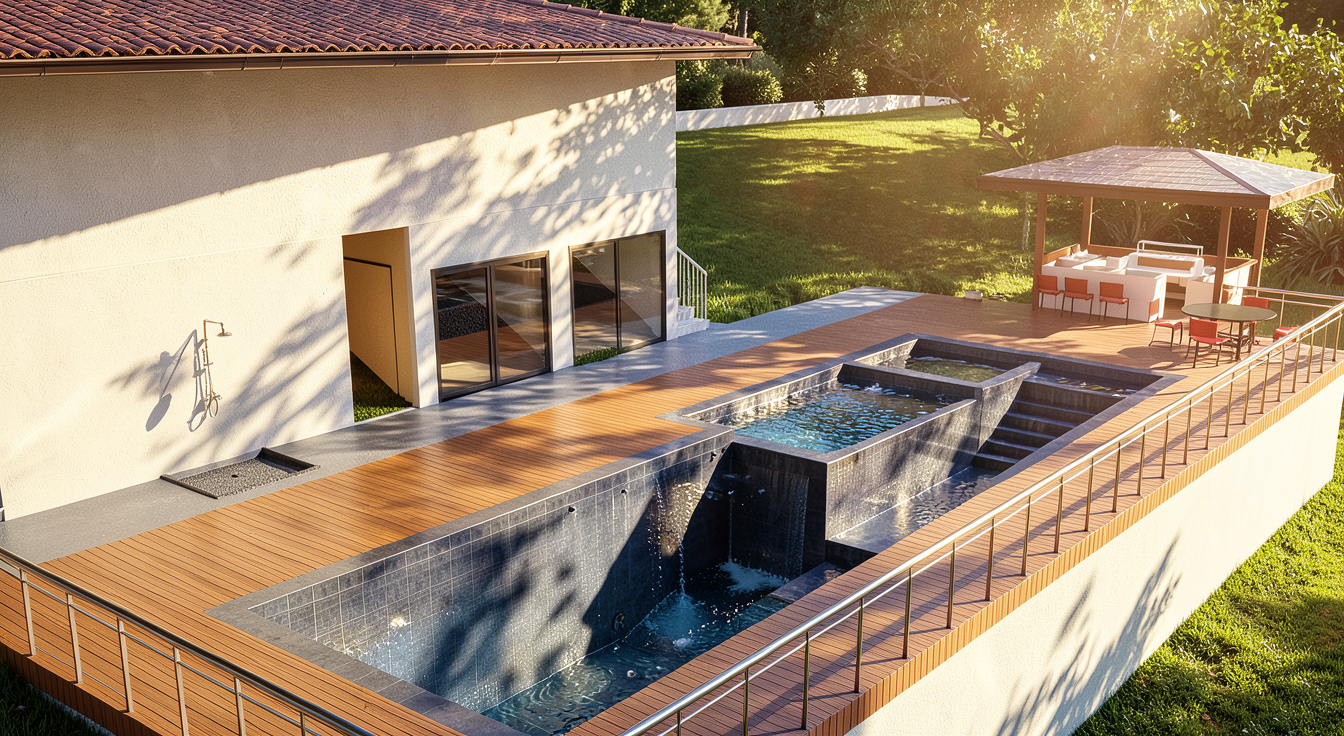 keep structure the same black shade sails are on second level patio add furniture inside and warm lighting place in a grassy vinyeard setting with two suv s parked in a gravel lot in the lower right corner add small shrubs and gravel pathways sunset lighting add 4 adults on second level patio drinking wine add two adults on bottom patio with a dog make the structure look like log cabin siding remove all purple it s glass