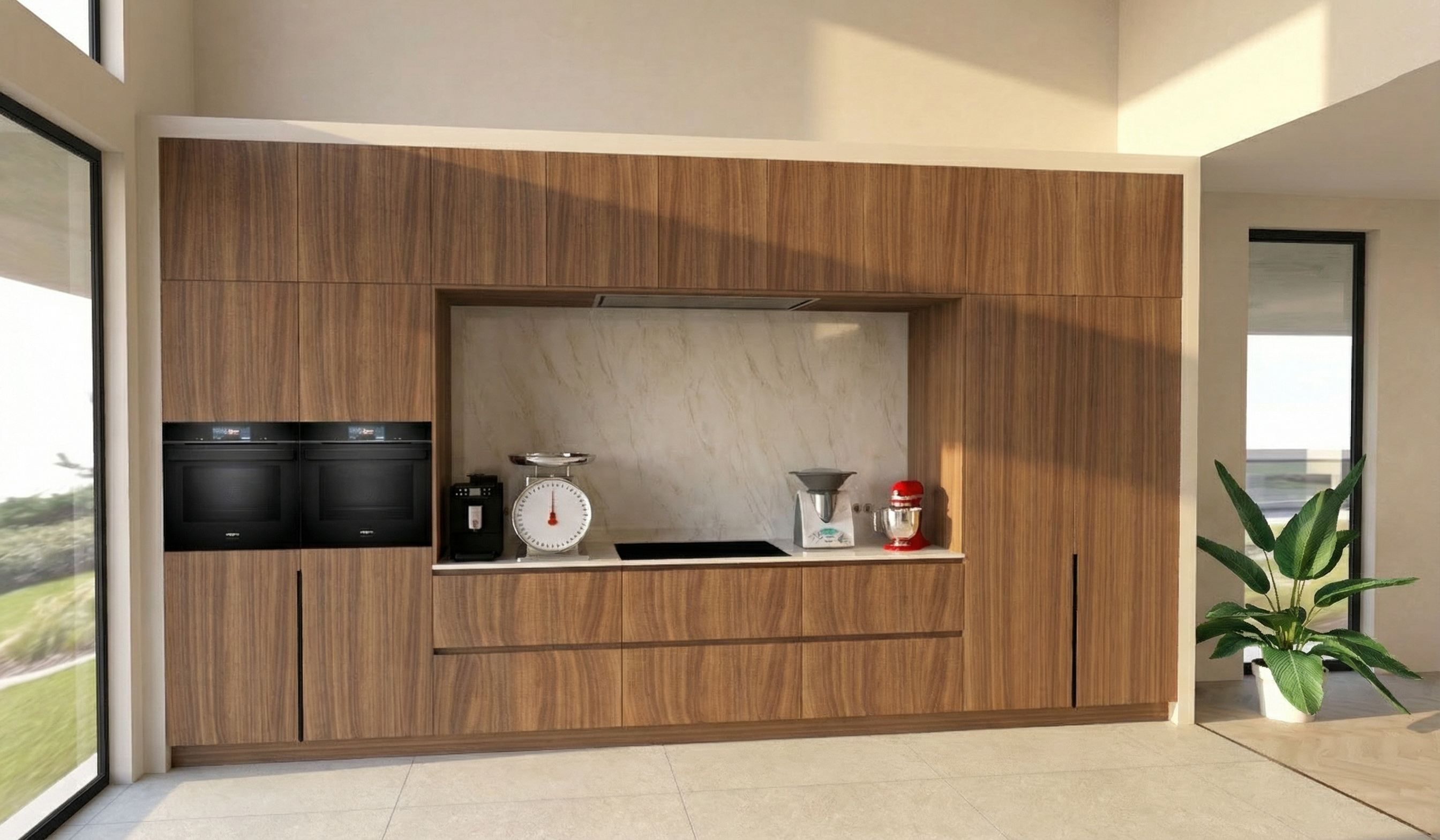 warm white color steel handles hatch are profiles of the kitchen