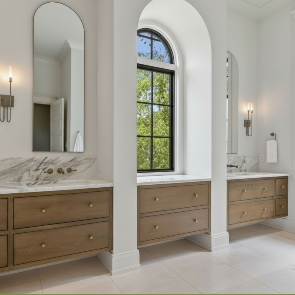 the walls below the counter top should be removed and the vanity should be one long one from wall to wall