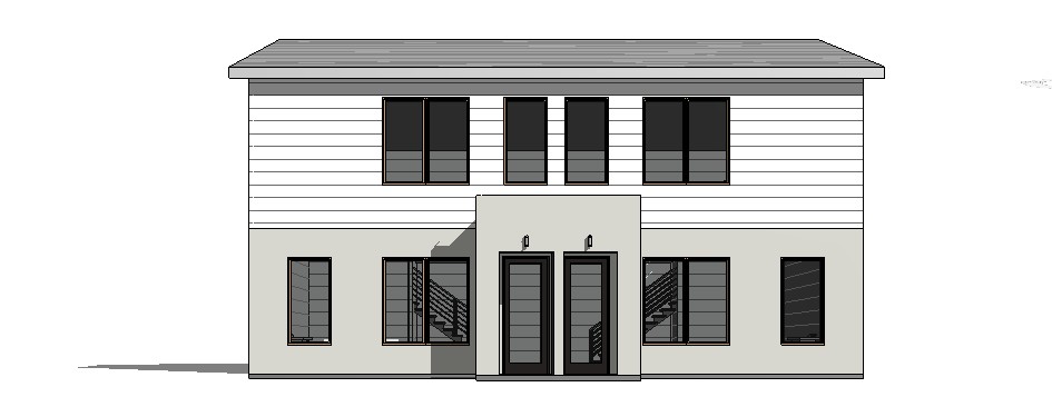 black frame picture windows off white stucco siding on first level 8 hardie siding on second level 4k render