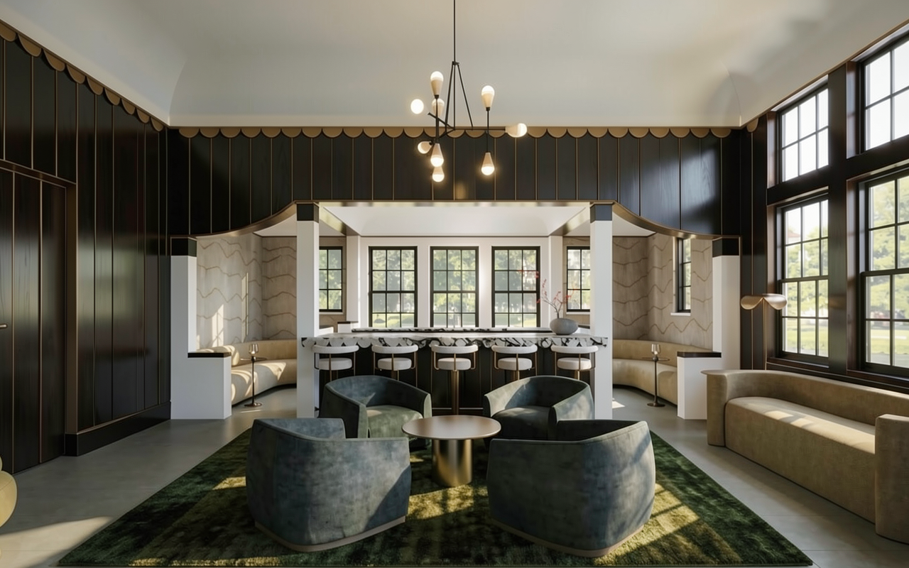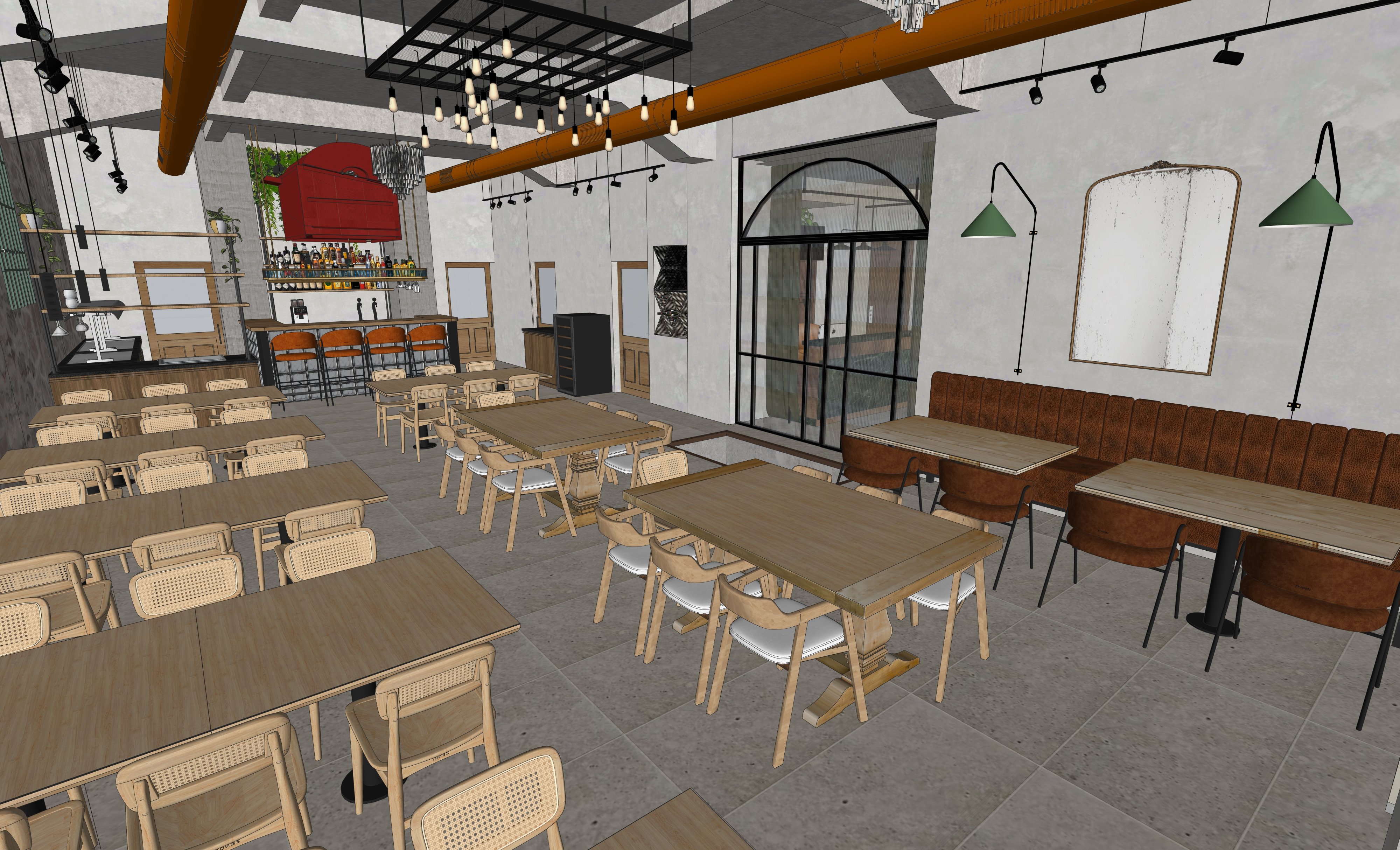 create a beautifully rendered image of a modern industrial style cafe interior keep the funiture and the propotions as shown the atmosphere is warm and inviting with a contemporary edge the tables are made of light oak wood surrounded by chairs with natural wicker seats the walls are a subtle textured concrete gray offering a chic urban feel overhead warm ambient lighting from pendant lights casts a gentle glow across the room the exposed ventilation pipes are painted in a rustic burnt orange adding a pop of color the eclectic bar area features a striking red canopy with various bottles arranged beneath it creating a vibrant focal point large windows with black frames allow natural light to flood in highlighting a plush deep brown leather bench along one wall the floor is made of polished concrete tiles enhancing the modern aesthetic green wall lamps add a touch of color and complement the greenery scattered throughout the space creating a harmonious and aesthetically pleasing atmosphere