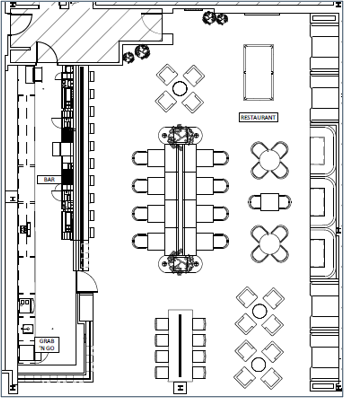 create a rendering for this hotel restaurant and bar it should be modern clean lines and warm accented by soft lighting warm neutral colors and warm wood tones accessorize with modern furniture