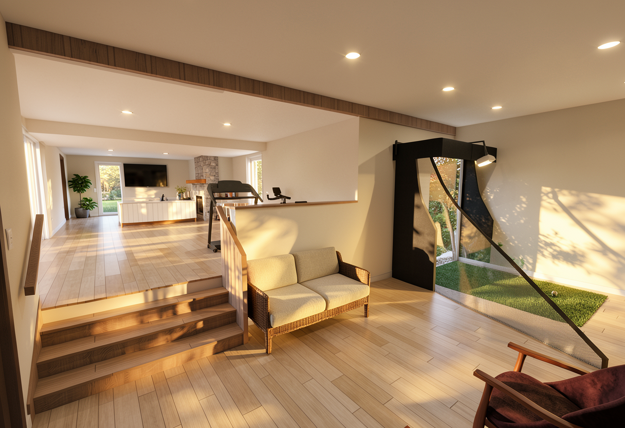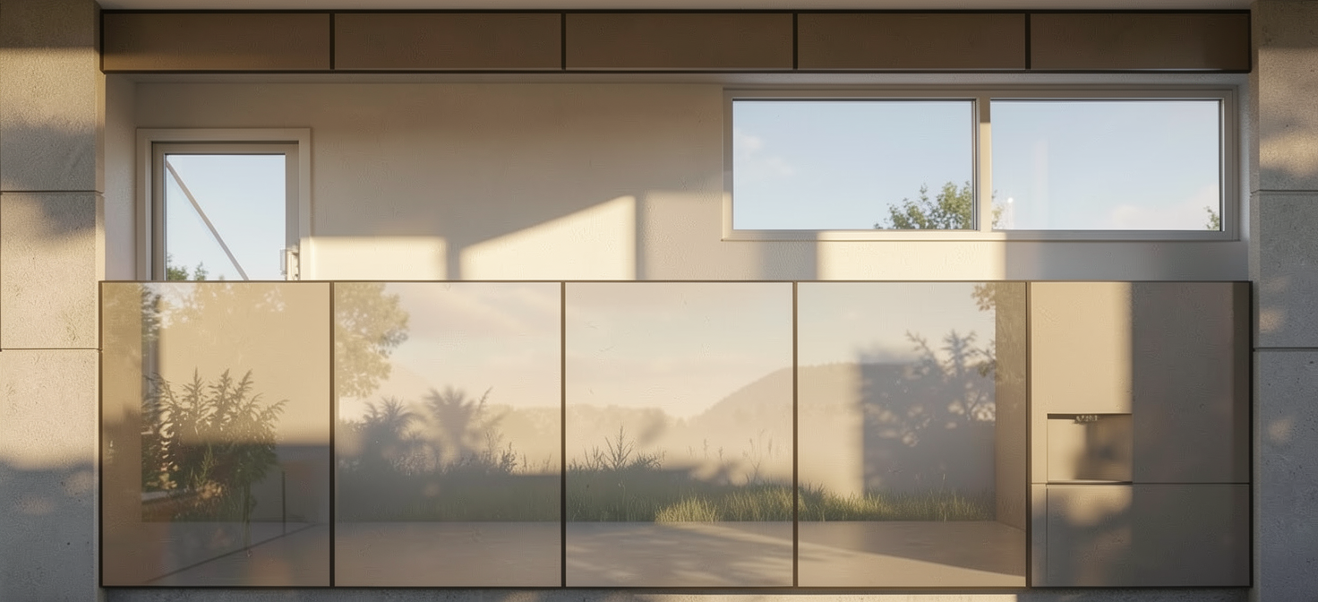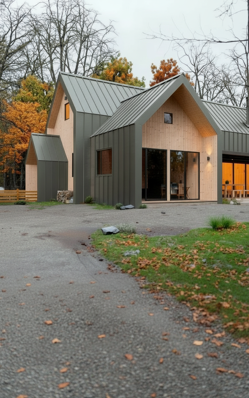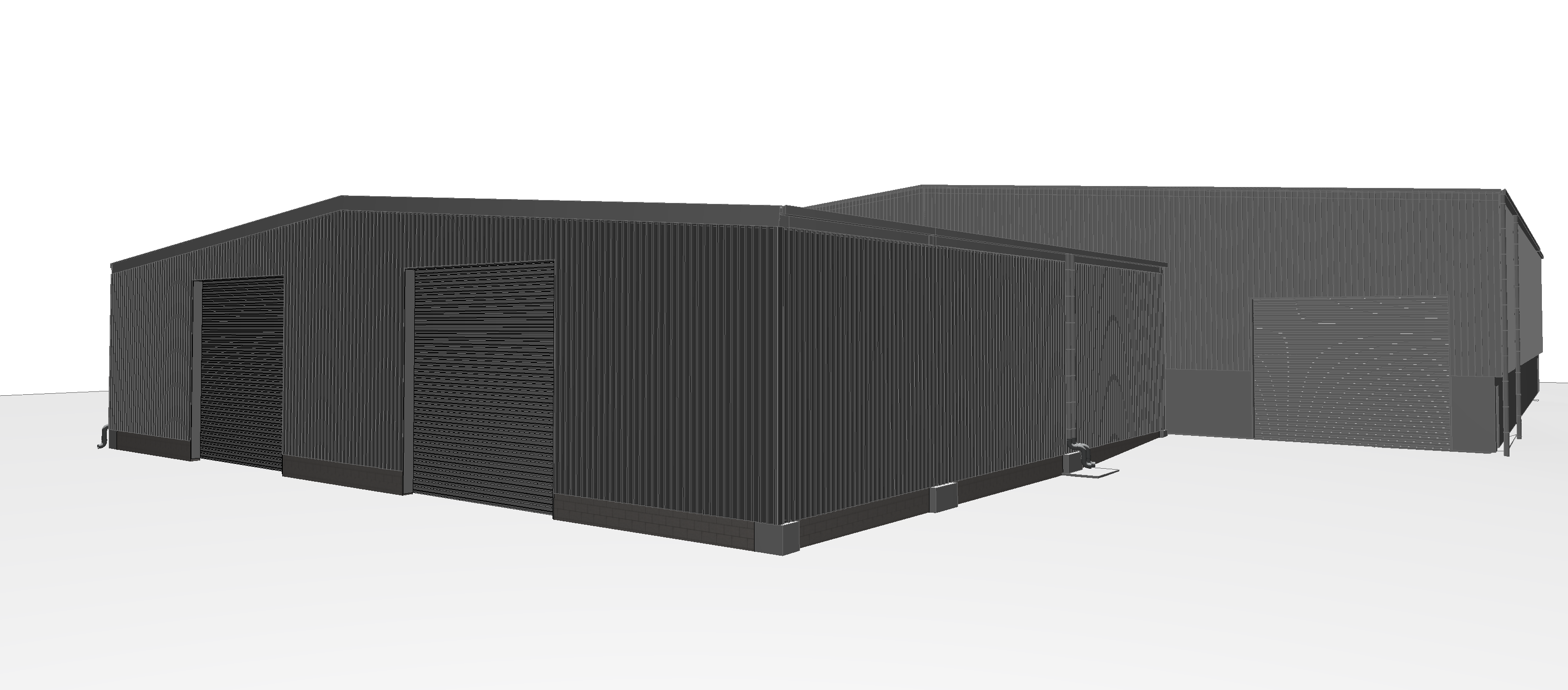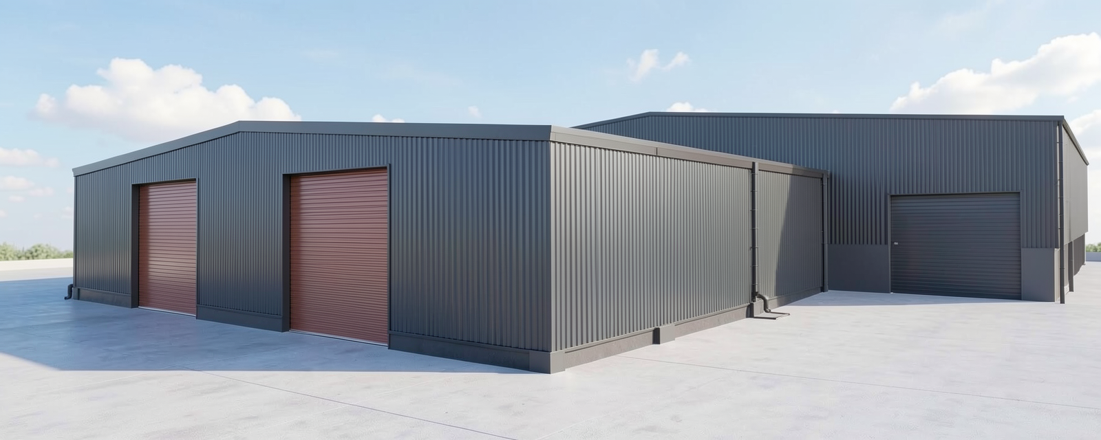 render a modern industrial storage building in a commercial setting the building structure is sleek and contemporary composed of corrugated metal panels in a rich charcoal gray the ground is paved in a smooth concrete with a subtle light gray tone the sky is clear and bright painted in a soft pastel blue with a few fluffy white clouds drifting gently the atmosphere is calm and inviting exuding a sense of tranquility and modern elegance in harmony with nature