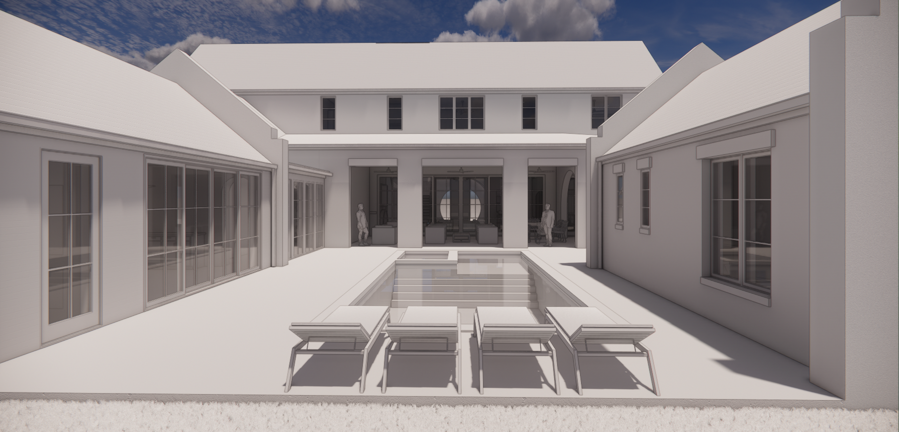 white stucco parapet walls soft blue sunset sky with hues of pink and orange scattered clouds narrow framed dark steel windows with dark trim very small black river stones in lawn no grass up light house more lighting through windows more ambient brightness on house make overall image brighter modern landscaping dark siding infill between upper and lower windows on the right dark siding and trim at center tower windows darker roof more light coming through windows make overall image brighter more landscape plants and lighting in the foreground more brightness on the house add pathway landscape and lighting to front sidewalk brighter light through center window tower dark trim at center window tower modern patio pavers around pool