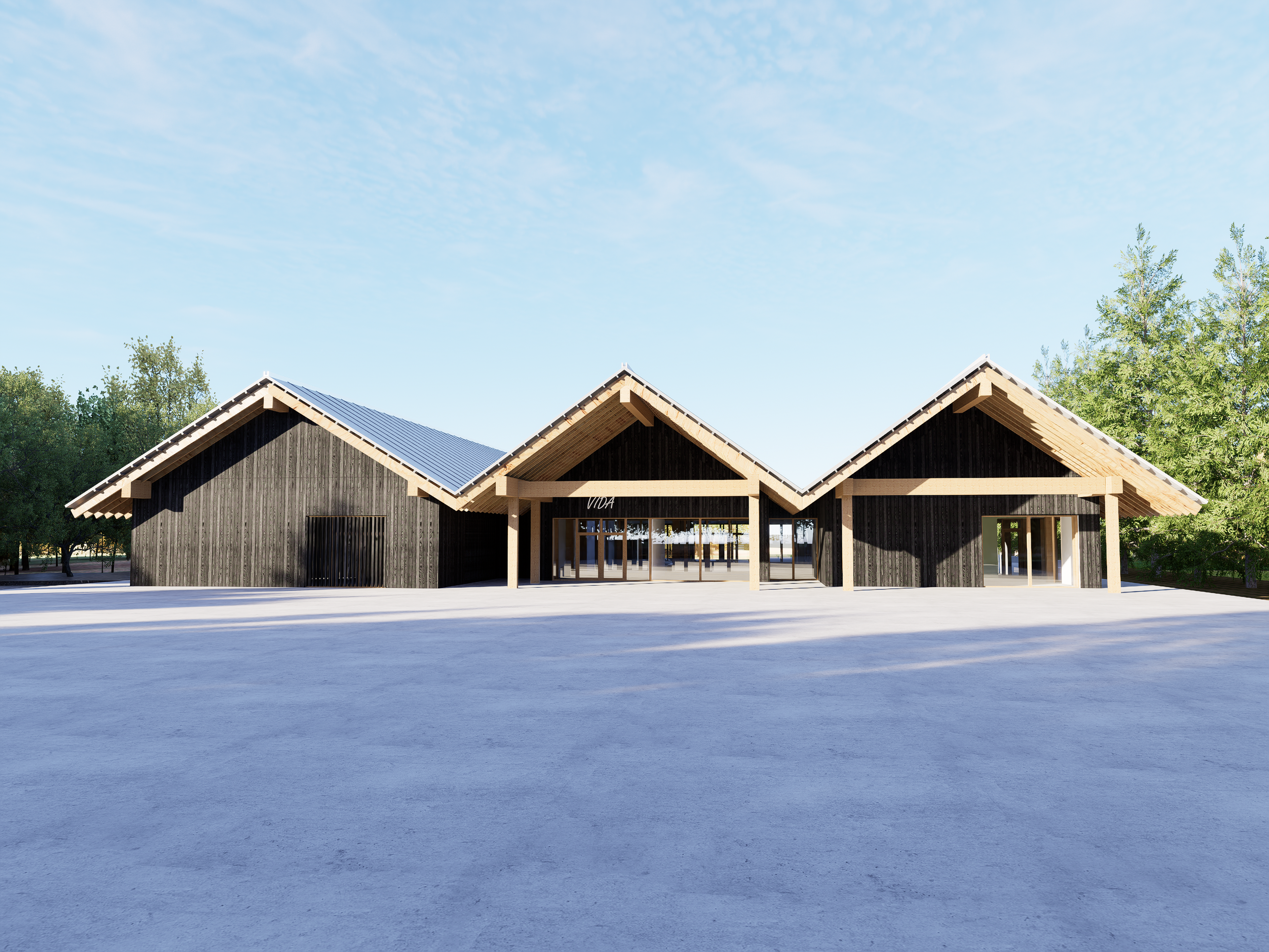 kengo kuma exterior shot render a serene countryside scene featuring a modern building with a black wooden exterior and light wooden accents the roof is a sleek silver grey metal surrounding the building are lush green trees under a clear blue sky the ground is a smooth light grey concrete the atmosphere is peaceful and bright capturing a clear sunny day architecture