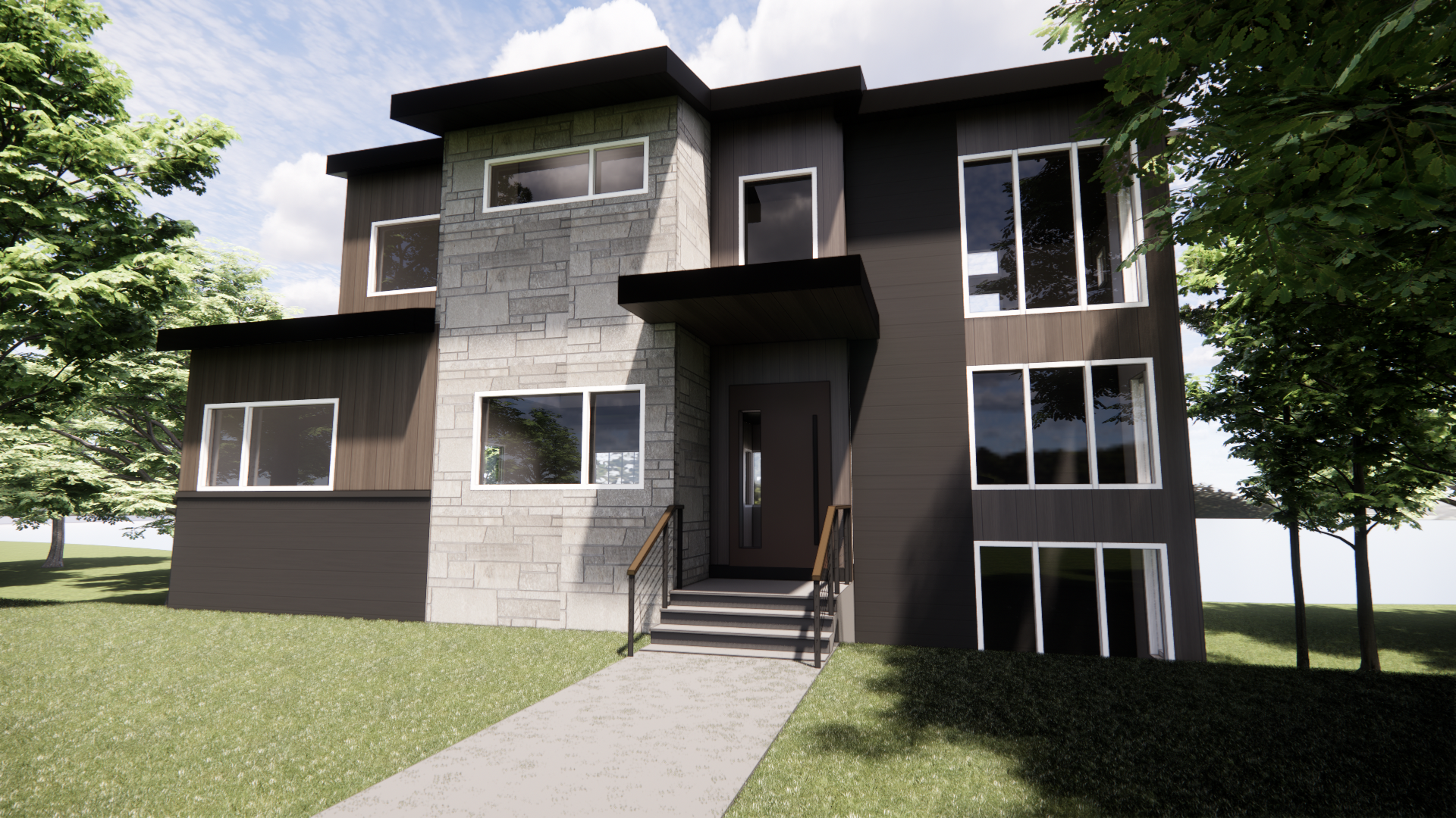 dark gray siding where shown stone where shown and vertical light brown wood siding where shown corten steel front door