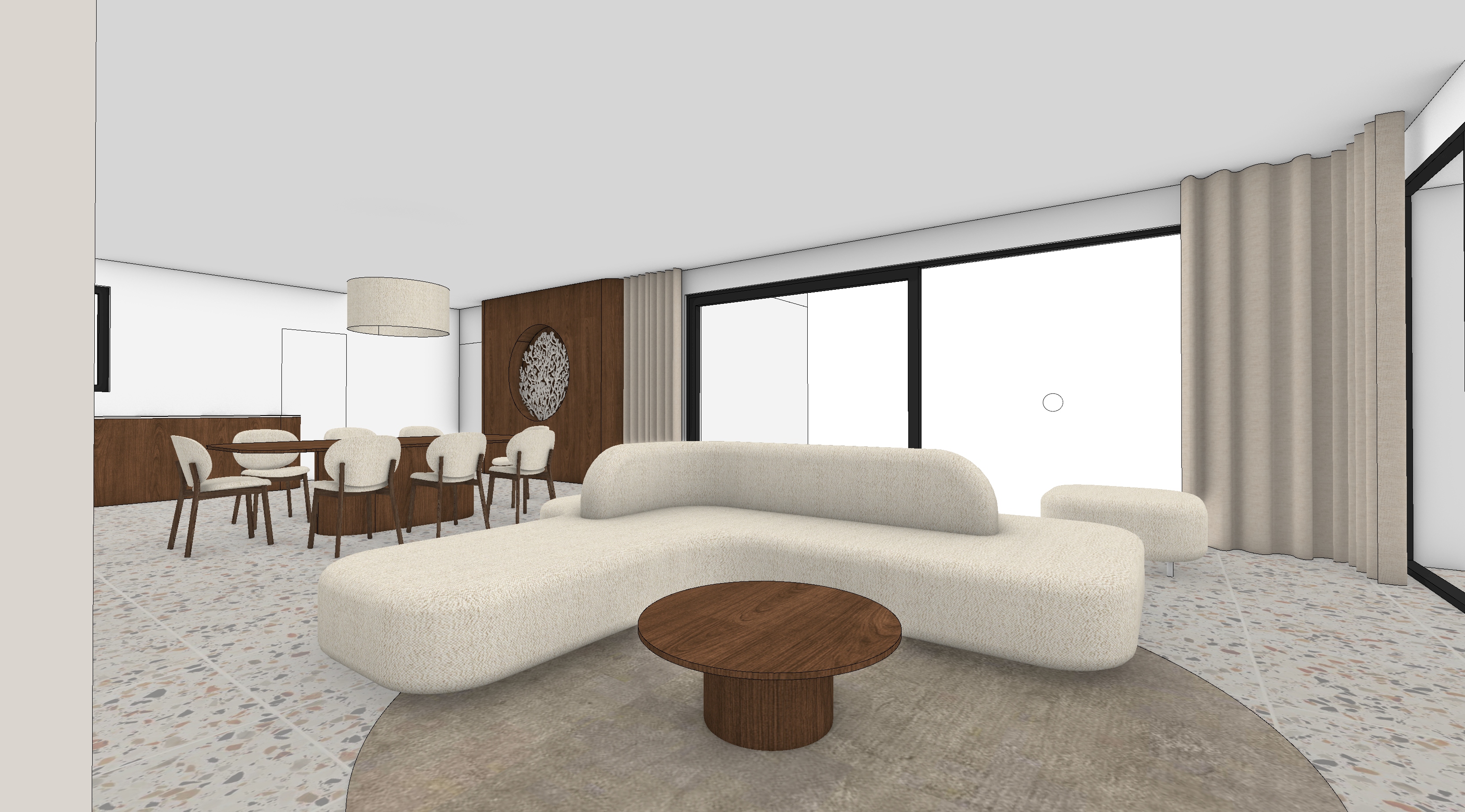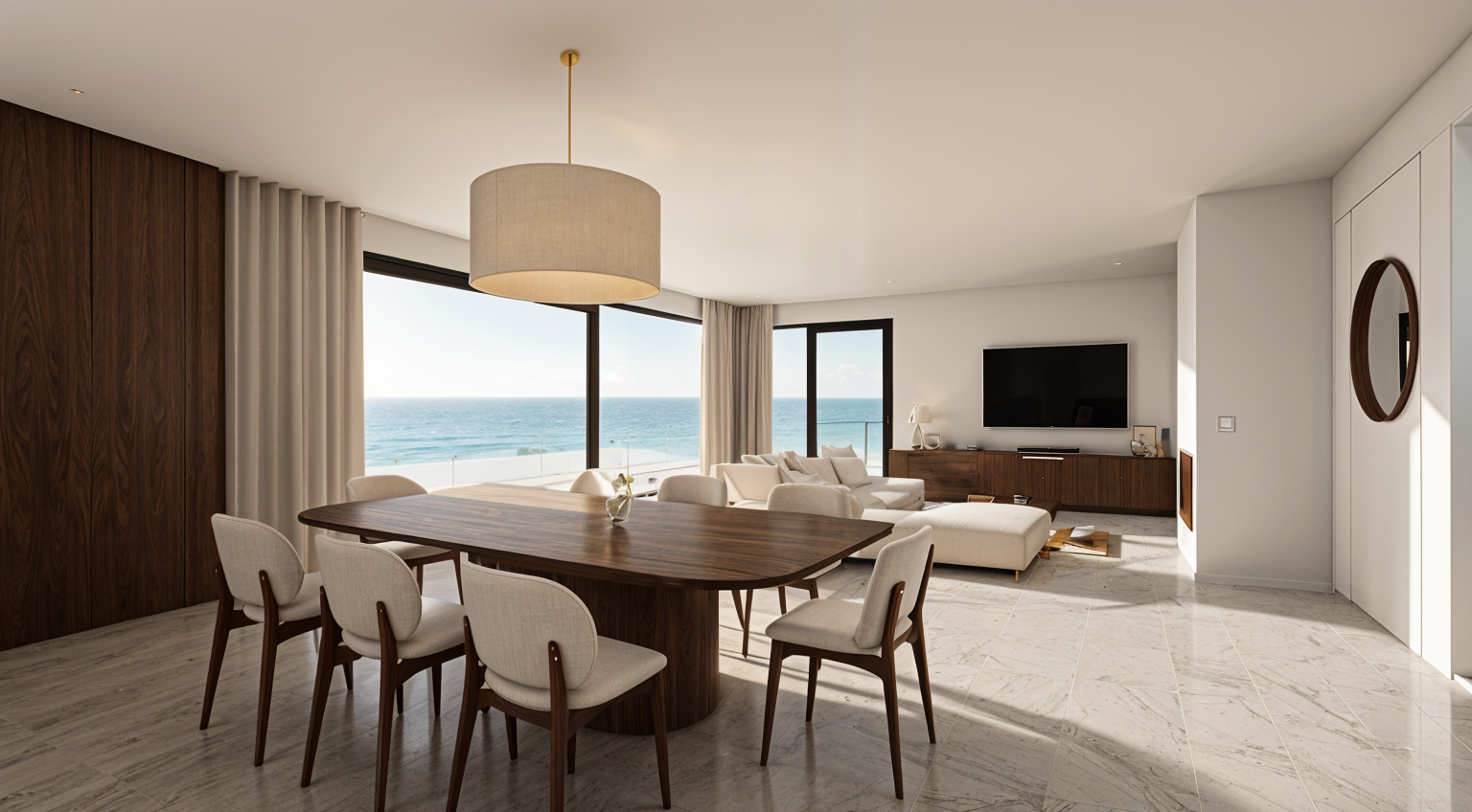 sea view behind the large window light glossy grey tan terrazzo tiles floor wall nut wood furniture soft creamy tones of fabrics