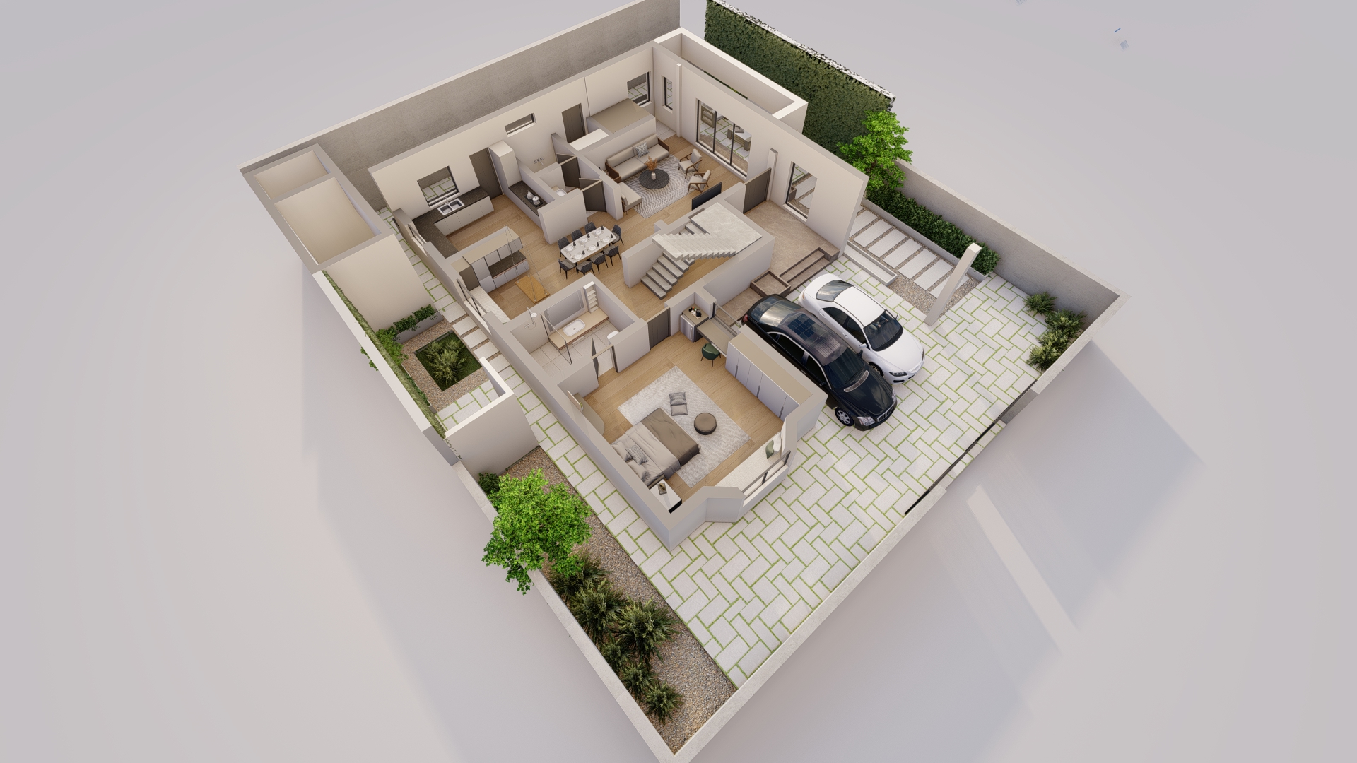 generate a high resolution presentation quality realistic isometric render of the provided space preserve all existing materials textures finishes and the exact original color palette without any alteration maintain the precise geometry furniture placement and surface detailing as shown apply soft neutral white ambient lighting with very low shadow intensity ensuring uniform illumination and high material clarity across floors walls ceilings and furniture avoid dramatic lighting harsh contrasts or stylized effects focus on crisp edges accurate reflections refined global illumination and clean visual balance delivering a polished professional architectural presentation suitable for client review