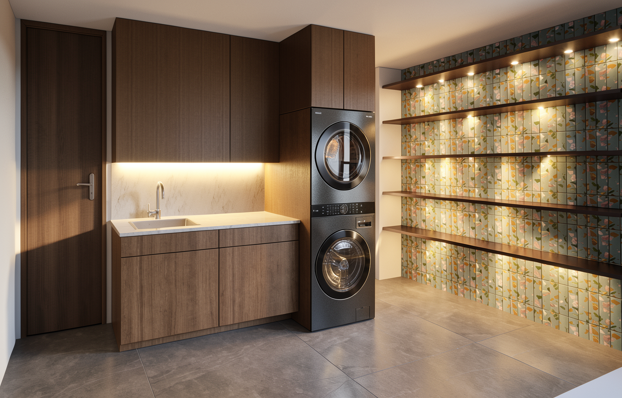photorealistic interior view of a lounge maintaining colors and geometry with dark green walls and charcoal colors ceiling with glass and gold metal framed shelving with liquor bottles behind the bar on the left side of the imagers with a tv between the shelves with granite bar top with gold and gray flex and movement in the stone golf simulator screens in the background on the large white surfaces midcentury lighting fixtures and furnishings casual bar patrons in casual clothing fun vibe art on walls with augusta golf courses golf merchandise on open shelves on the bottom right corner of the view