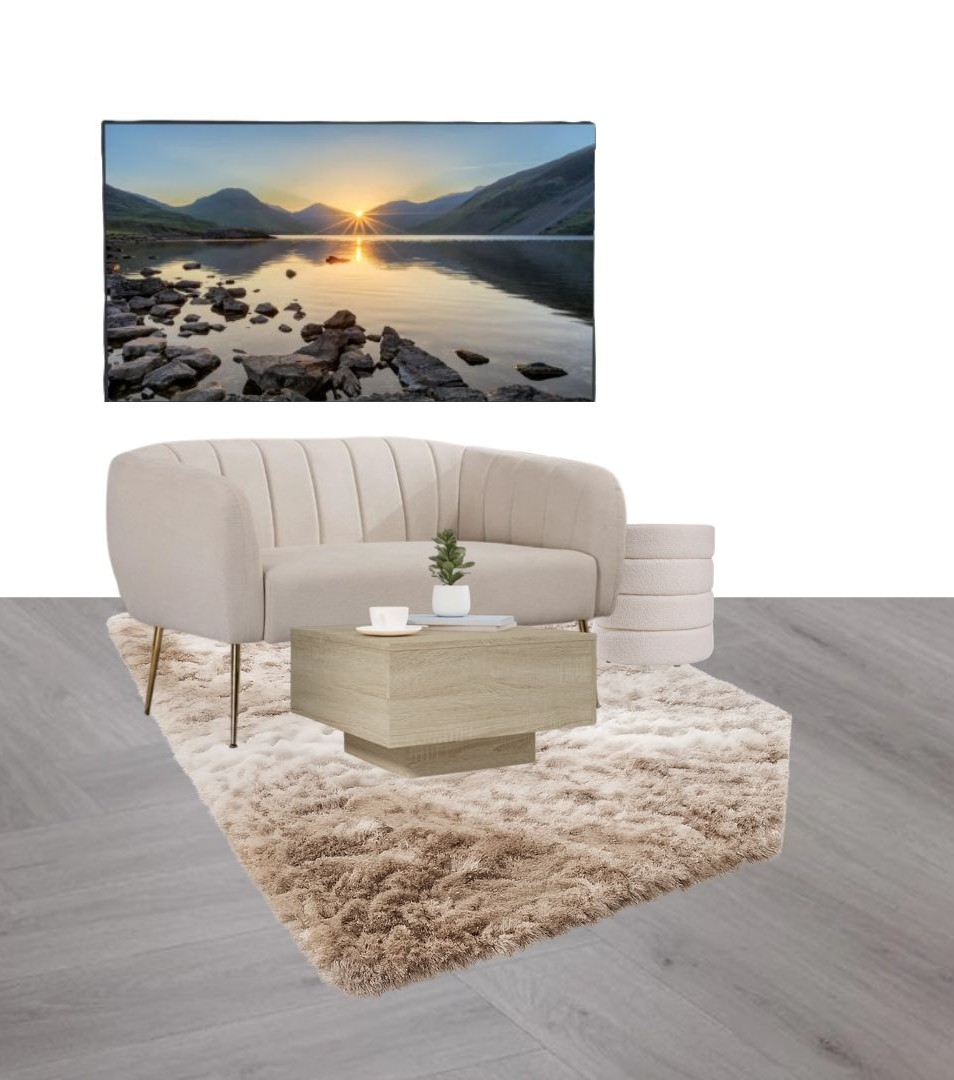 can you please put these items of furniture into a realistic room setting with white walls and grey laminate flooring please note the image of a lake is actually a tv screen with a black frame please put the tv behind the sofa and do not change any of the colours