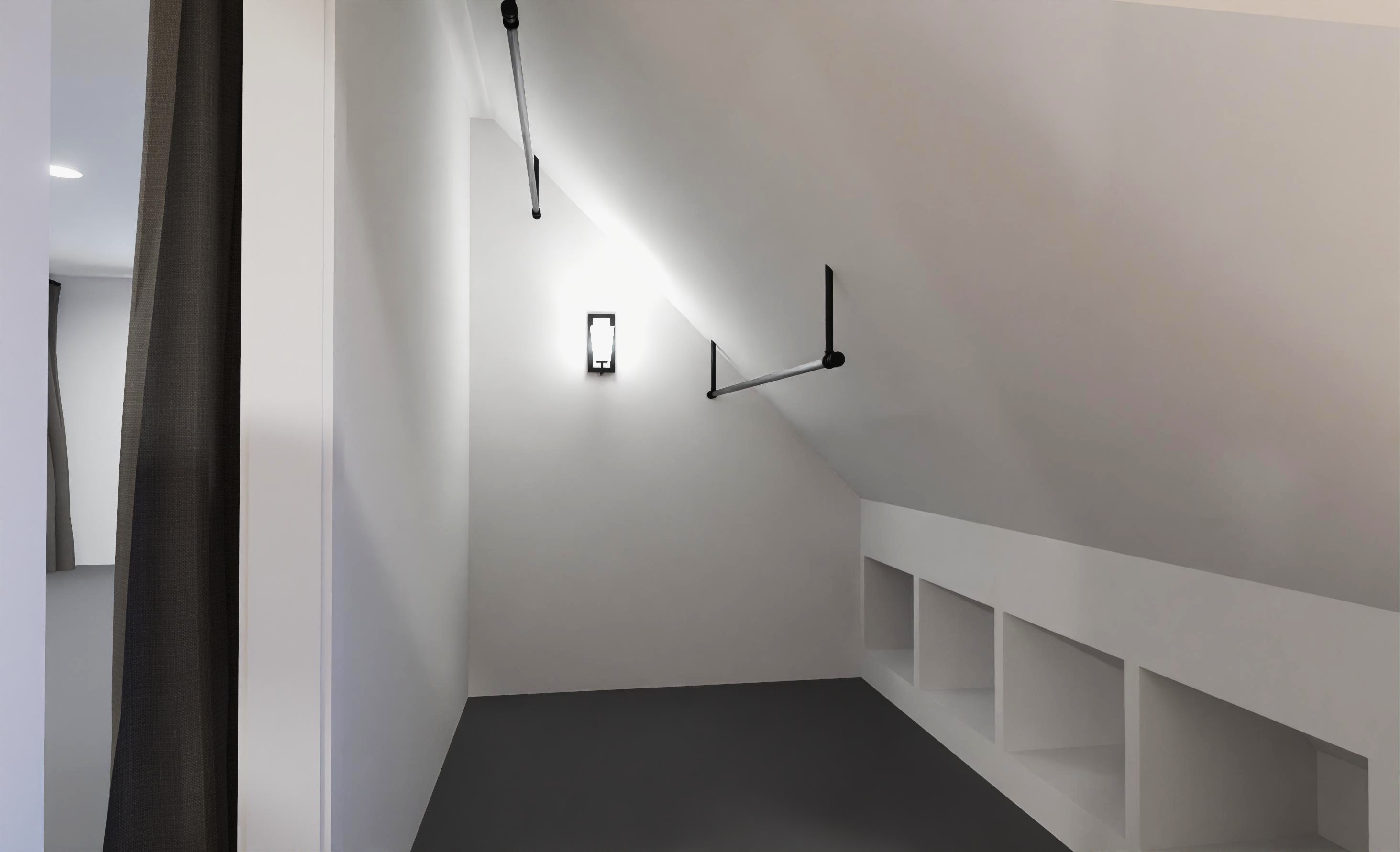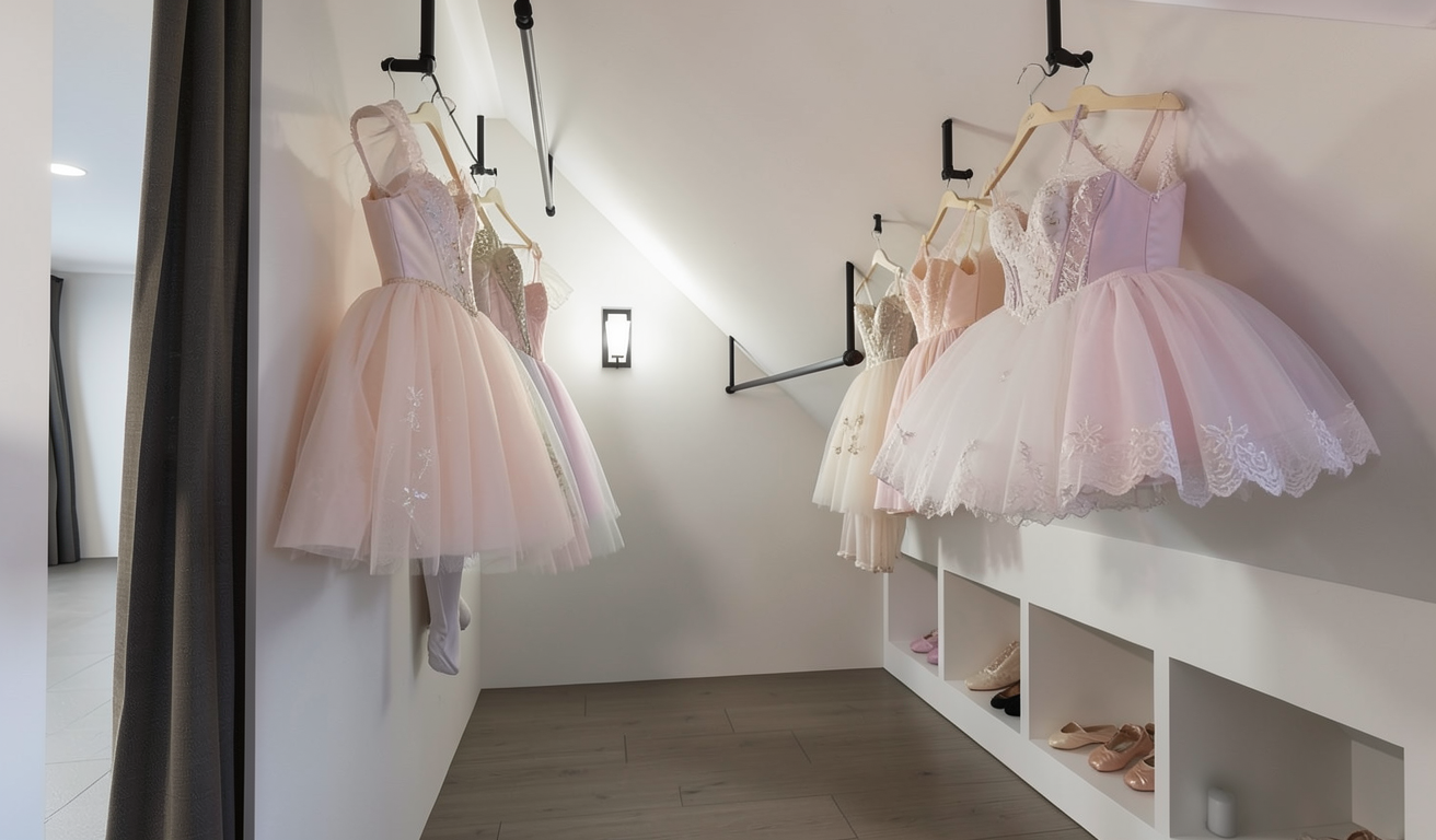 place some ballet costumes hanging from the two existing rods and some ballet slippers in the cubbies do not add new rods place items on the rods shown