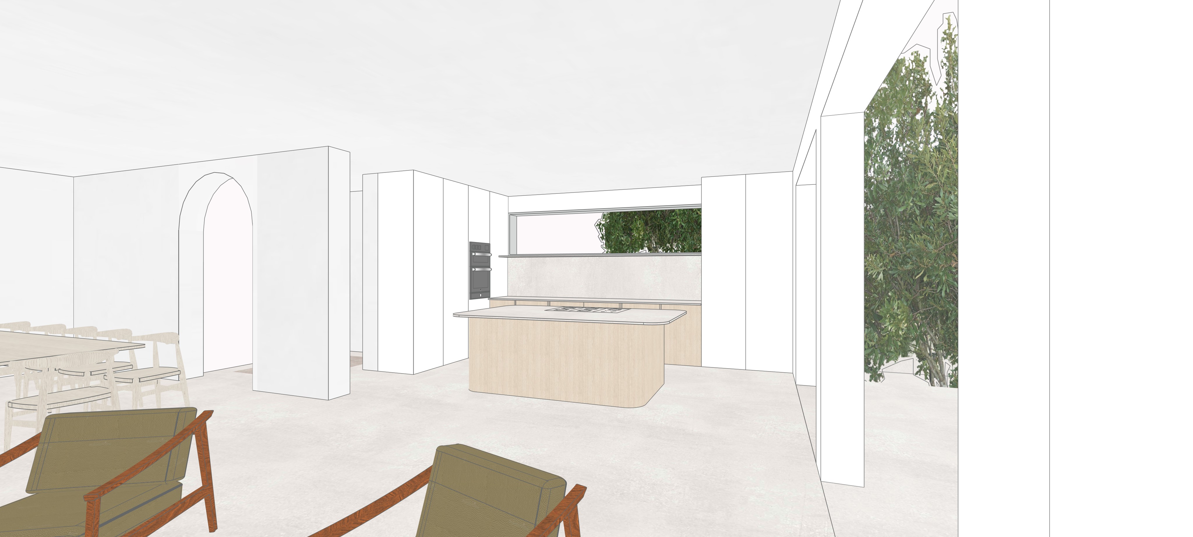 earthy mediterranean open concept living space minimalistic design off white textured walls and ceiling create a clean airy atmosphere natural light floods the room through large windows with lush green trees visible outside adding a vibrant contrast mid wood tones for the kitchen island and dining furniture enhance warmth neutral sandy colored floors provide an earthy balance olive green cushions on sleek chairs introduce subtle color depth soft relaxing ambiance with a touch of nature for tranquil living make the tall kitchen units a light grey add light grey frames to the large open external wall openings