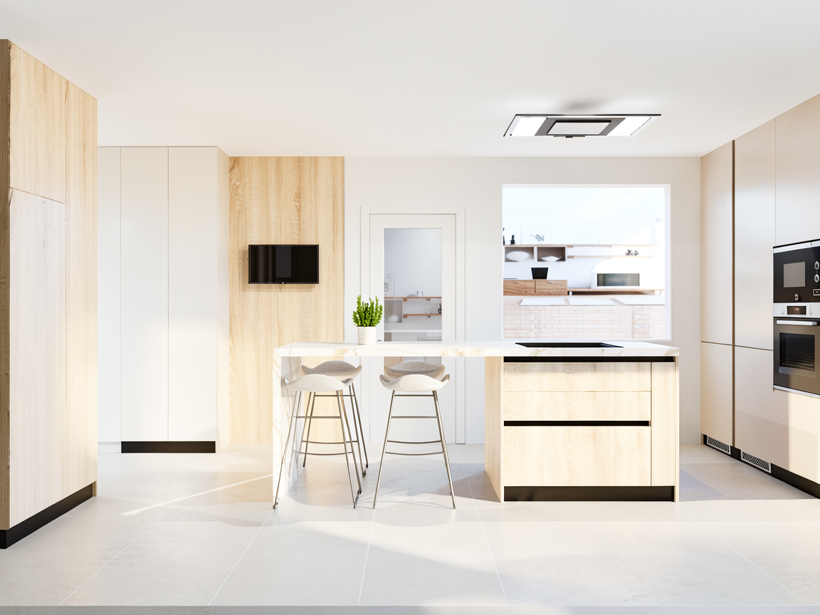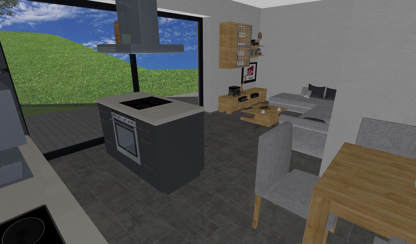 erstelle hiervon ein 3d rendering sehr moderne einrichtung stilvoll im skandinavischen design minimalistisch wichtig ohne abzugshaube au enpanorame s dtiroler berge