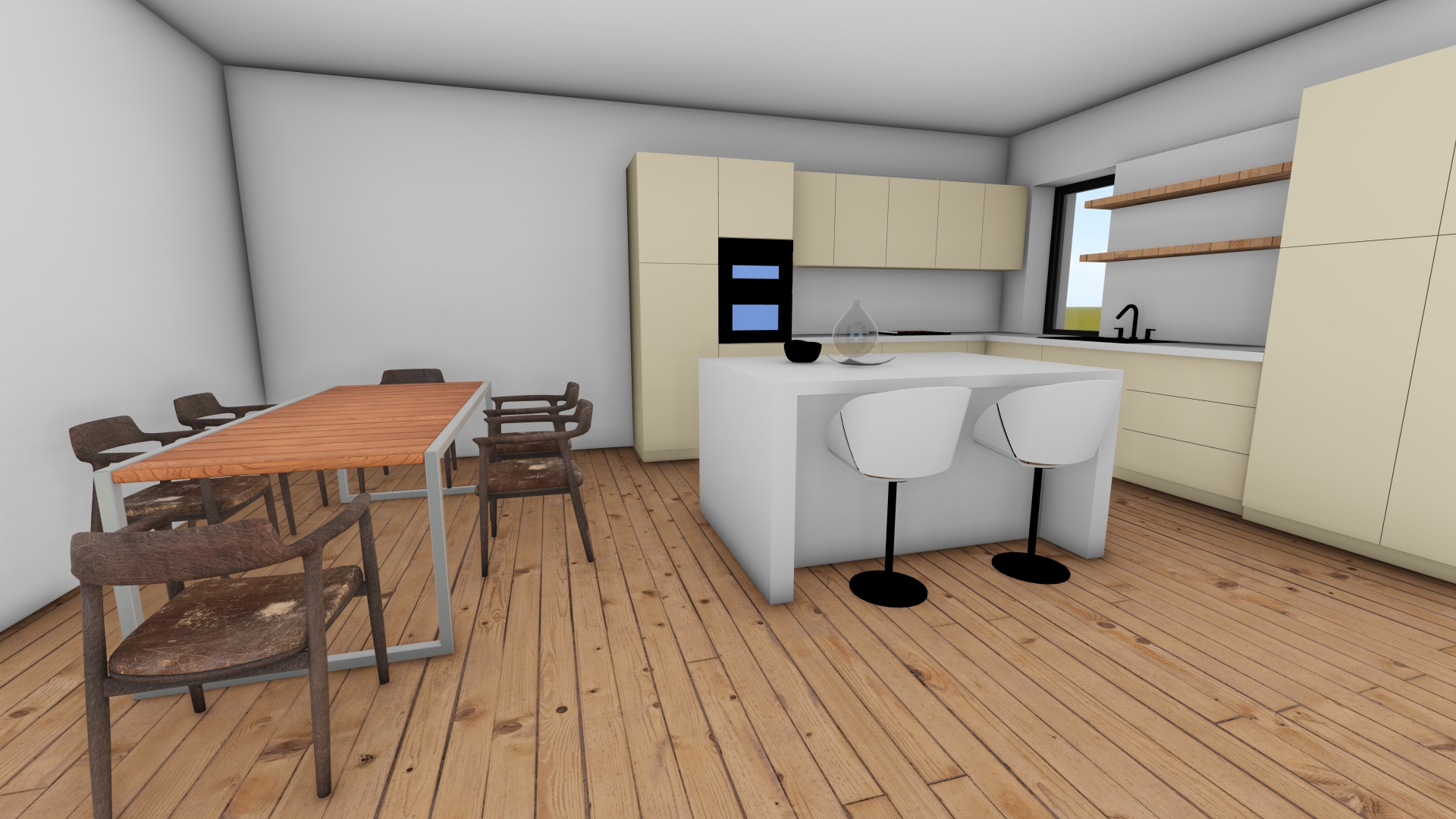 open plan japandi interior seamless kitchen and dining area light oak wood finishes modular beige sofa glass globe pendant lights large windows with sheer curtains natural lighting high end architectural visualization soft earthy tones minimalist aesthetic