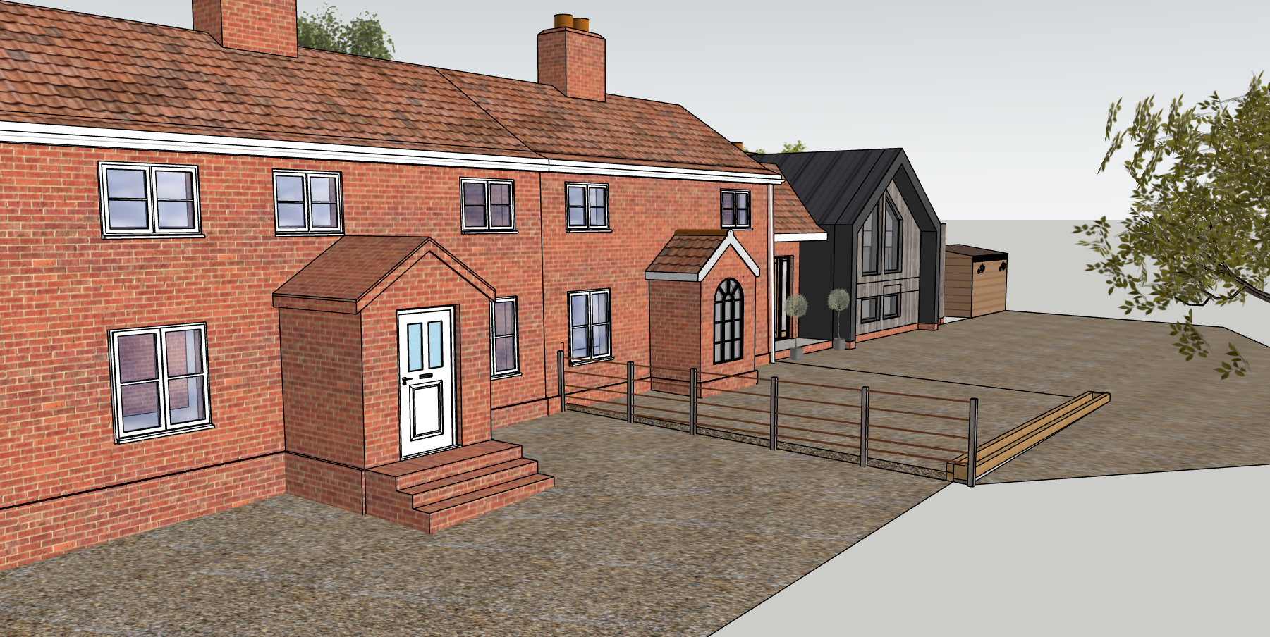 red brick original cottage with a tradition clay pantile roof barn style extension clad in weathered grey silver tone vertical wood cladding with a charcole grey steel roof and steel cladding to wrap the extended gable the linking section that joins the old farmhouse and new extension is a redbrick section with oak vestibule door in natural colour finish and matching clay pantile roof windows doors soffits drain pipes and barge boards on the redbrick house are white whilst windows on the timber clad extension are charcole grey to match the roof colour