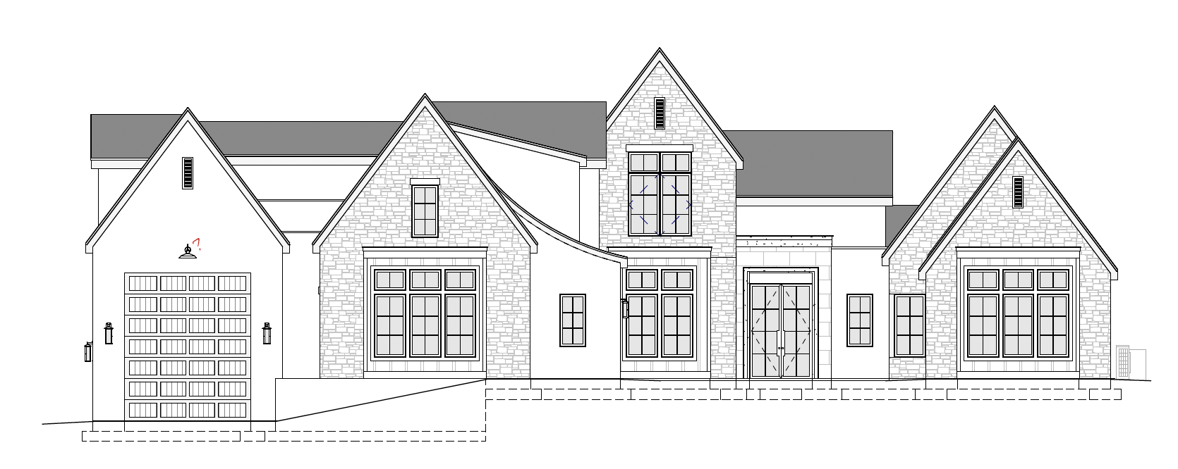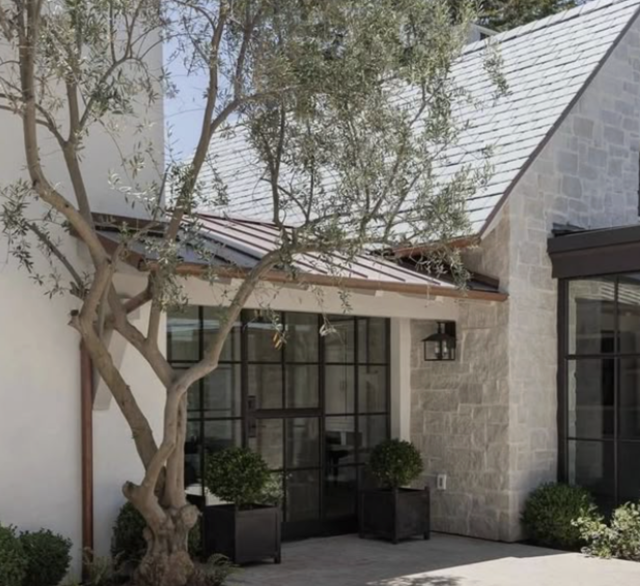 exterior shot render a beautiful architectural visualization of a modern elegant house with a classic symmetrical design use soft beige for the brick walls and a dark charcoal grey for the roof shingles highlight the windows with white frames to create contrast set the scene in a calm twilight atmosphere with a gentle glow from warm toned lights illuminating the exterior add lush greenery around the house featuring deep green grass and a few slender trees the sky should be a gradient of soft purples and pinks to enhance the serene and inviting ambiance
