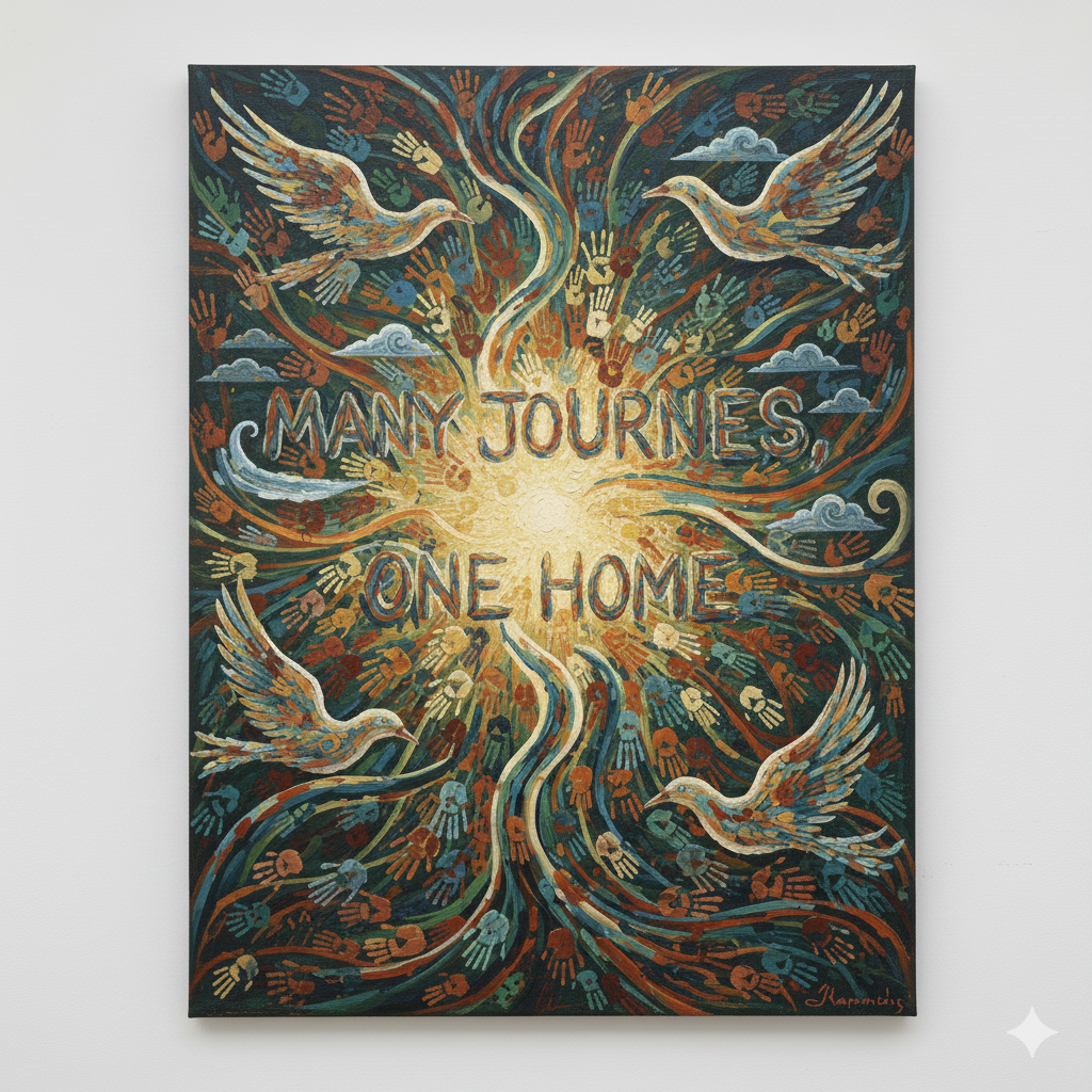 replace the text many journes one home with many journeys one home without changing the colour palette of the original graphic