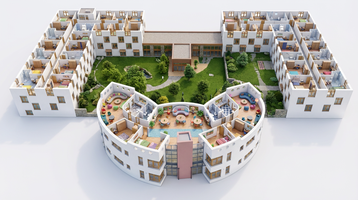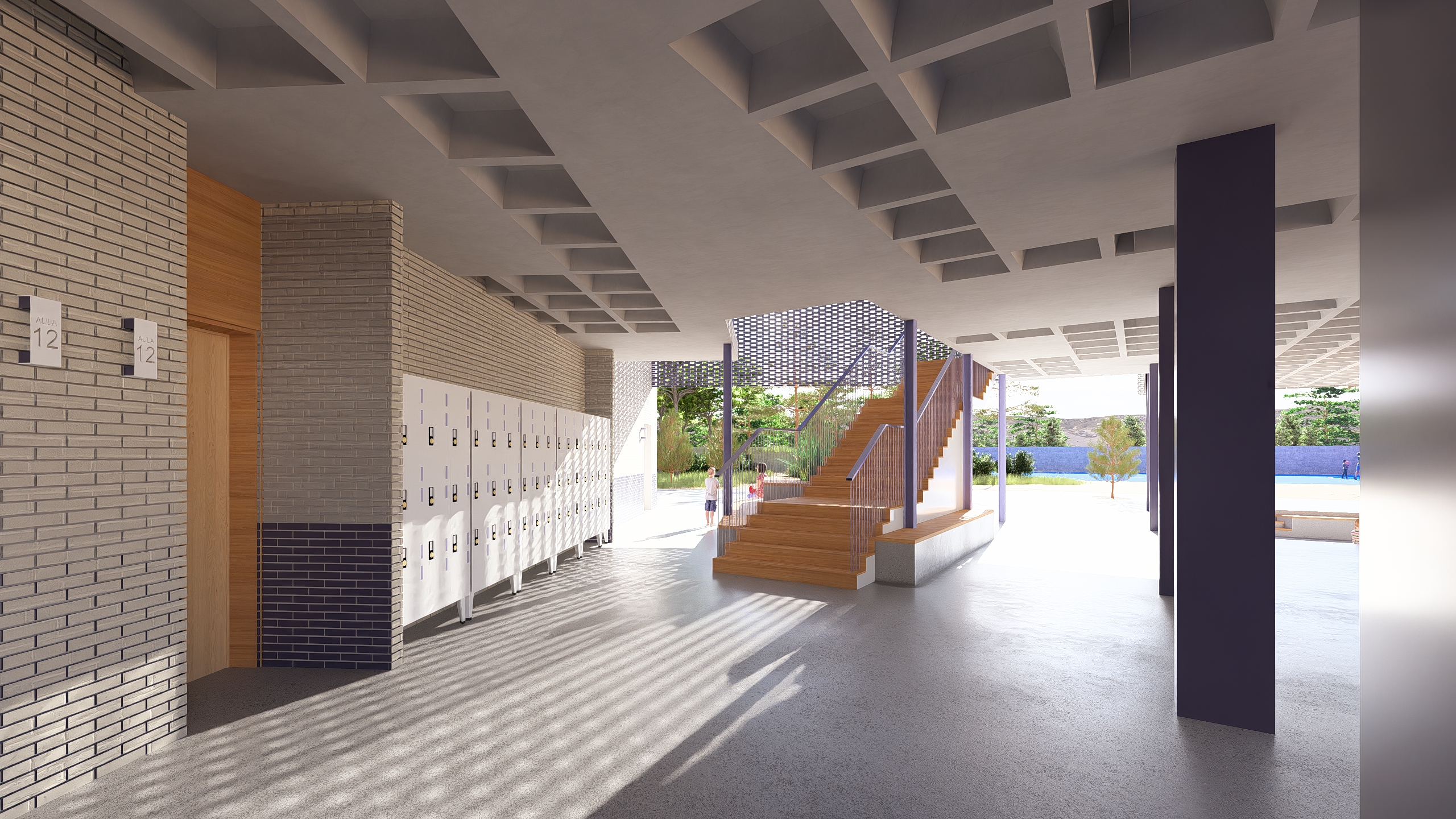 enhance the existing image of a school interior corridor do not add remove or modify architectural elements furniture or people preserve the original composition and geometry exactly improve lighting quality stronger natural daylight entering through windows and lattice enhanced global illumination realistic light bounces and higher dynamic range emphasize the existing light and shadow patterns created by the lattice making them clearer and more defined but still natural increase overall brightness while keeping highlights controlled no overexposure soft realistic shadows subtle volumetric light and improved contrast refine materials and textures for realism pbr look enhance reflections slightly on the floor without exaggeration maintain a clean natural architectural visualization style photorealistic render enhancement balanced exposure no new objects no people added no changes in layout