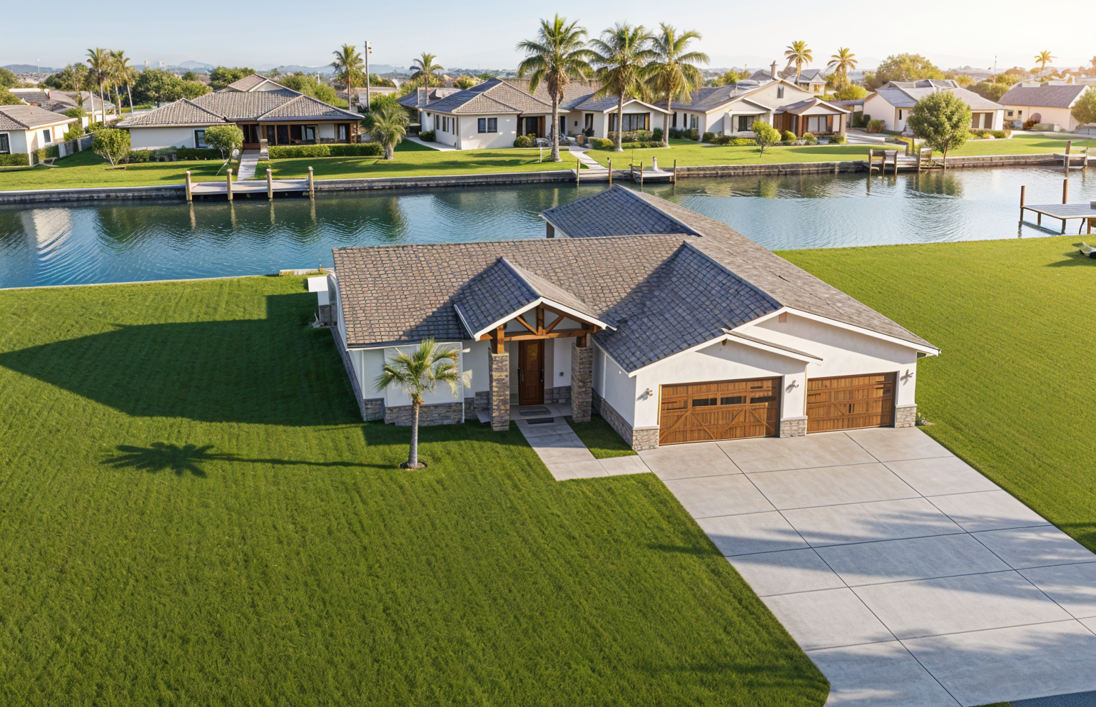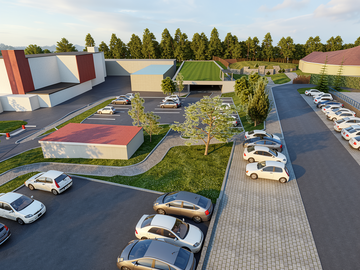 render a beautifully detailed industrial building set in a natural environment the building features a modern white facade with red accents on doors and windows surround the building with rich greenery incorporating lush dark green shrubs alongside vibrant yellow bushes the sky is clear with soft sunlight casting gentle shadows creating a peaceful atmosphere the ground is covered with a mixture of dark green grass and grey gravel in the background include dense leafy trees in shades of green to add depth and contrast to the scene