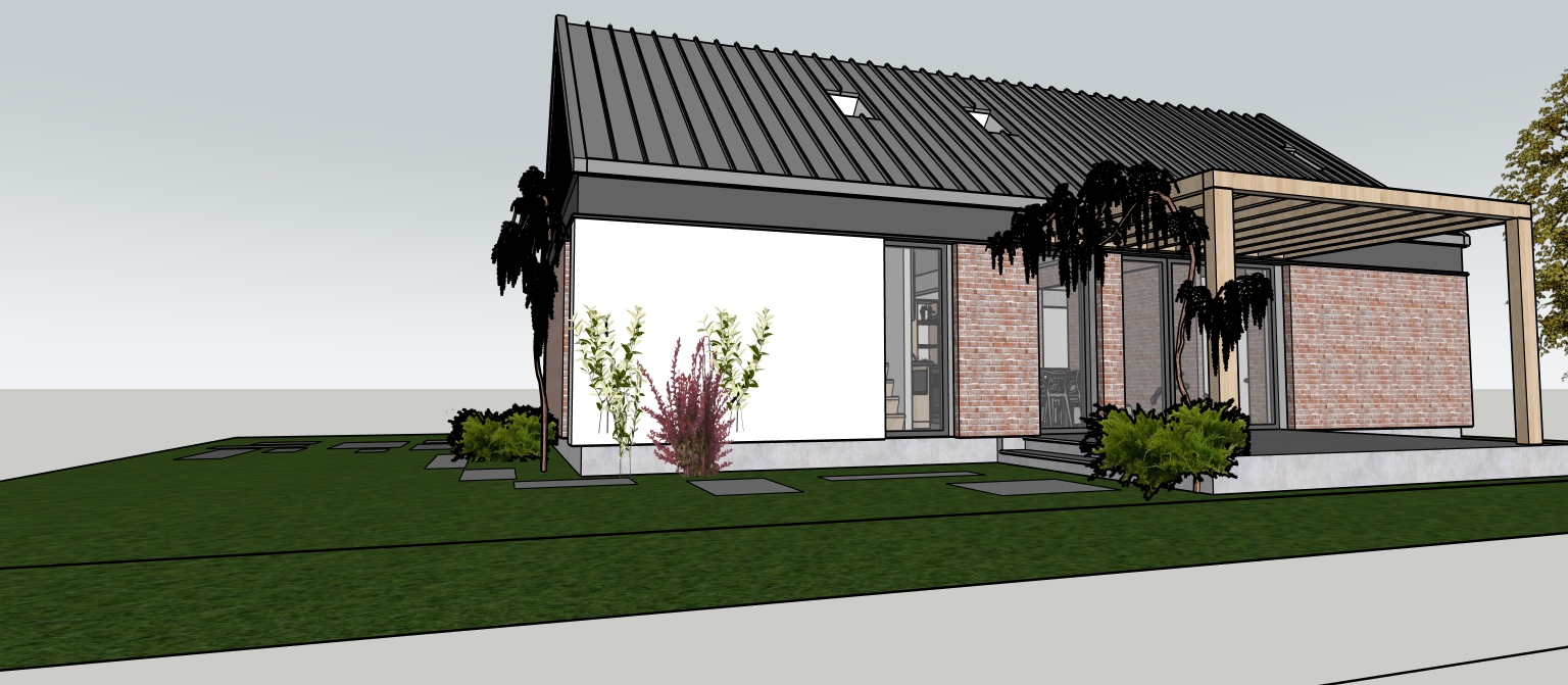 render in hyper realistic architectural visualization quality make a lush vegetation that looks native to the european area more temperat continental vegetation put furniture on the terrace and one kid one parent and a dog white plaster wall on the left groundfloor walls white plaster old brick fistfloor traingle fronton wall wood light essence separation between groundfloor and firstfloor metallic beam dark gray roof seam metal roofing window reflecting sourranded area keep material where i put them do not modify anothing at the construction of the house