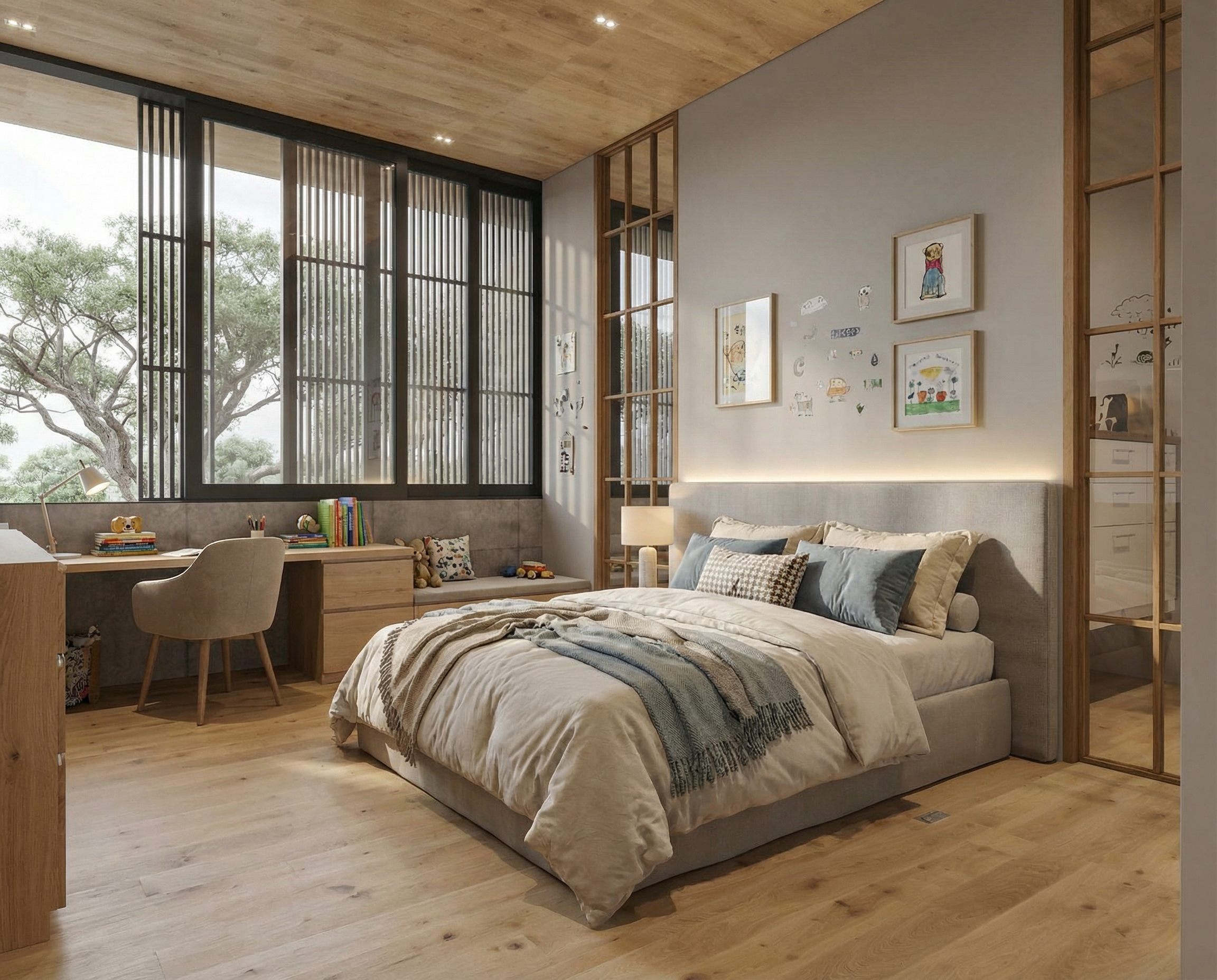 create a photorealistic interior render of this furniture keep the exact cabinet geometry layout and door divisions cabinet fronts and side panels warm taupe beige laminate medium tone caramel beige color with slight grey undertone darker than cashmere and sand colors matte finish uniform laminate color countertop and interior of the tall display cabinet natural oak wood medium oak tone warm brown oak color realistic wood grain not light oak not bleached oak correct grain scale matte finish showcase thin black aluminium frame clear glass door and glass shelves lighting warm led under the floating cabinet warm led integrated into the edges of the glass shelves spotlight in the top of the display cabinet environment minimalist living room light plaster wall natural oak wooden floor style high end furniture showroom render ultra photorealistic materials realistic laminate surface realistic oak wood texture soft shadows global illumination cabinet fronts handleless flat fronts no handles no grooves no finger pull cutouts push to open opening system