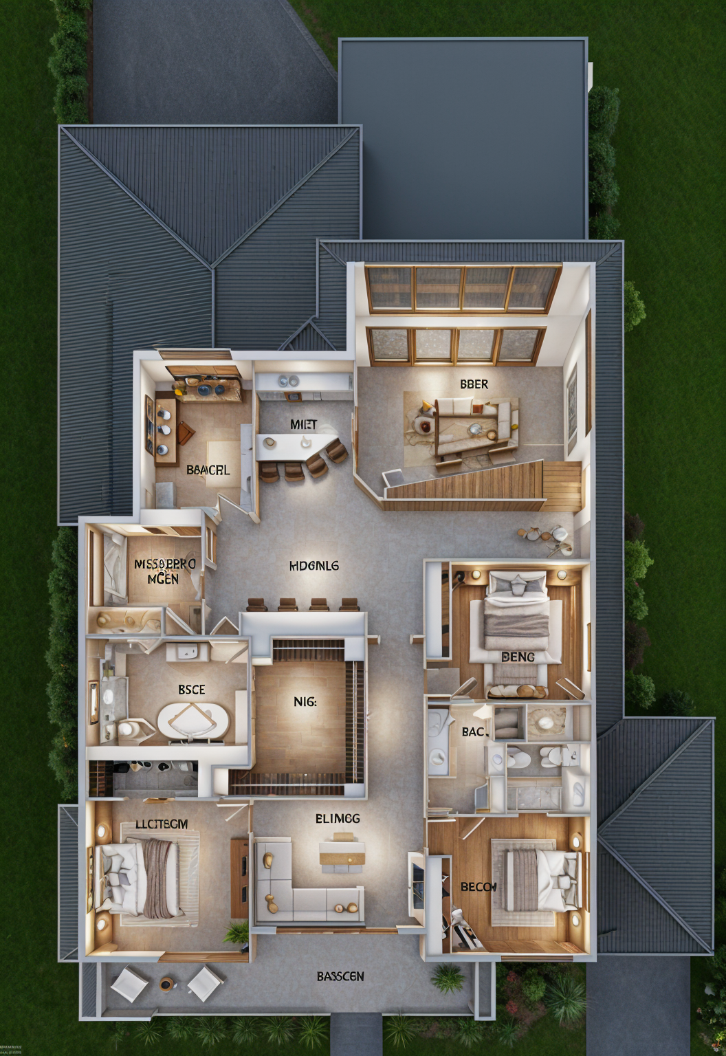 this the outdoor deck area on the first floor of a small modern home there is a 4 piece bi fold window between the kitchen and the deck with a small bar and high top tables the main door to the home is a solid black wooden door in the background there is an exterior tankless hot water heater on the rear exterior wall the exterior of the home is in black board and batten vertical siding and the deck boards and ceiling boards are a reddish stained walnut beyond the deck should be spruce and pine trees with golden hour lighting