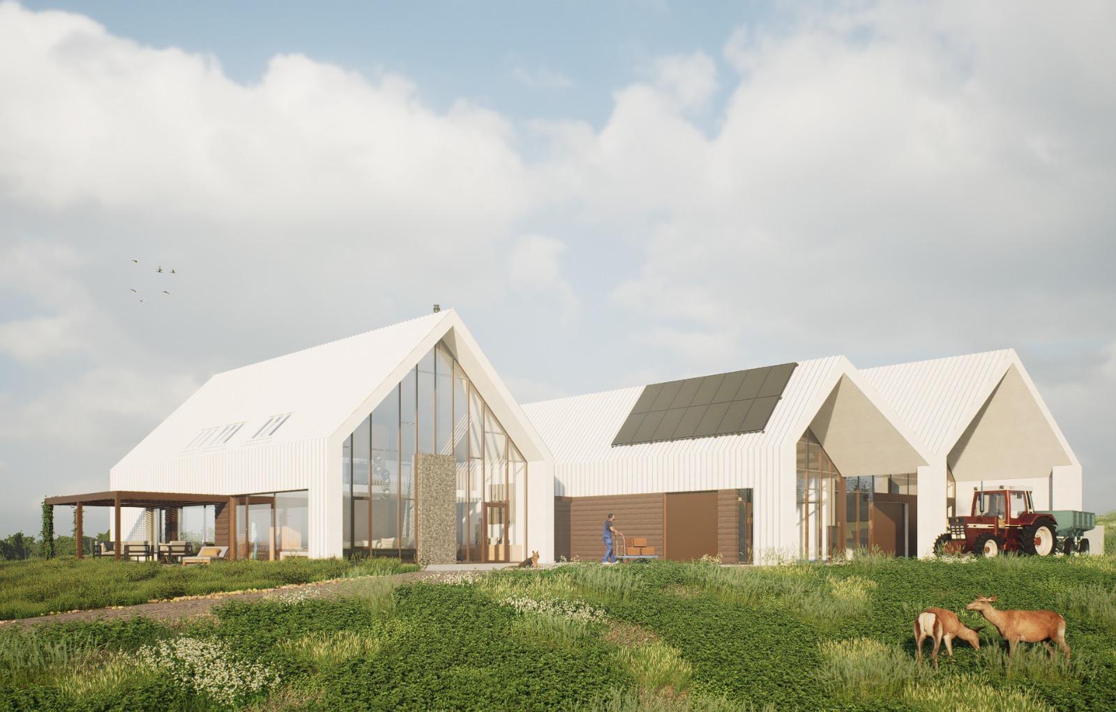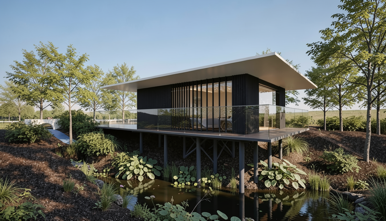 exterior shot style and proportions of the cabin but exaggerate the roof angle so it becomes more vertical and iconic material light metal or white standing seam metal panels atmosphere cinematic architectural visualization soft evening light realistic forest environment highly detailed vegetation photorealistic render architecture