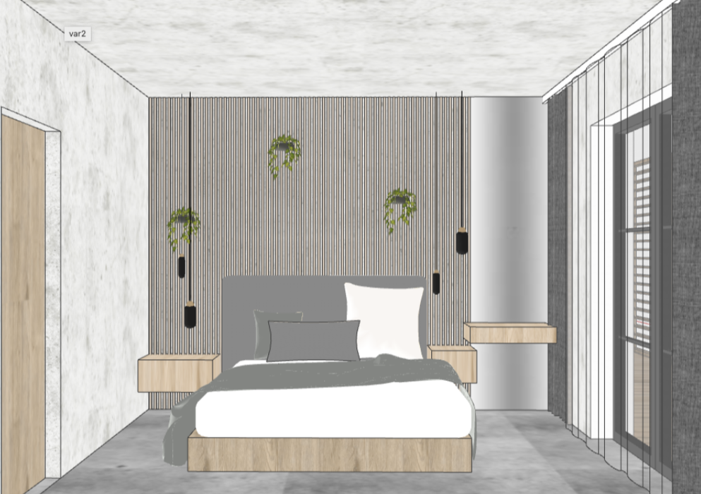 create a modern bedroom interior with a calming and minimalist atmosphere feature a smooth gray concrete floor the walls should be light textured gray with a wood accent wall behind the bed a large mirror on the right featuring vertical slats include a bed with a light wood base gray headboard and soft white bedding complemented by gray and dark gray pillows add elegant pendant lights in black hanging from the ceiling place small potted hanging plants with lush green leaves on the accent wall the room should be lit naturally with soft sunlight filtering through sheer white curtains on the window and a sleek wooden door on the left
