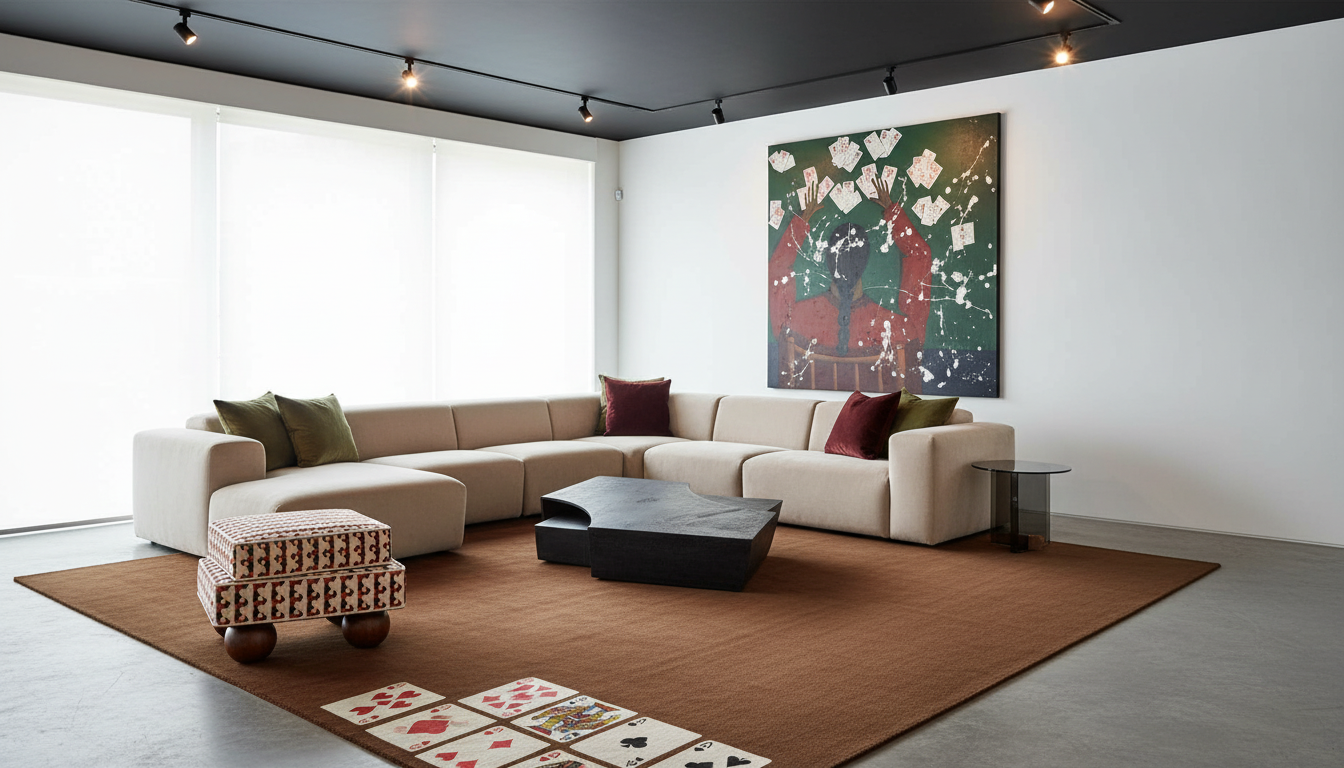 room floor is concrete walls are white ceiling is double height and black the art work is very big above the sofa lighting is track light add irregular big dark brown rug with burgandy border put the side table besides the sofa add cushions on the sofa in burgandy and olive green i need straight on front elevation view add the buff seat at the rug corner