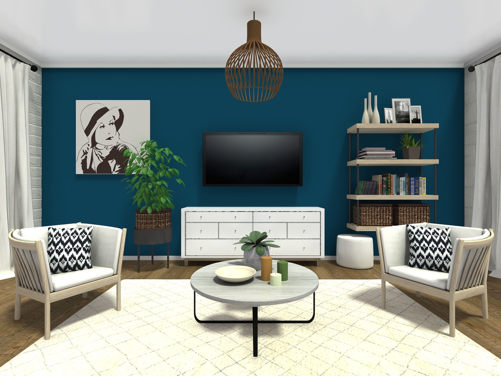 render a modern living room with a chic and inviting atmosphere the walls are painted a rich teal blue providing a bold backdrop two contemporary white armchairs with black and white geometric patterned cushions sit on either side of a sleek round coffee table the coffee table features a white marble top with various decorative items a green plant a neutral toned vase and small candles a woven pendant light hangs from the ceiling casting warm lighting a wooden floor with a subtle grain pattern supports a soft cream colored area rug on the wall there s a stylish black and white art piece depicting a figure in a hat a chic black flat screen tv is wall mounted above a minimalist white media console with sleek drawers nearby an indoor plant in a woven basket adds a touch of greenery on the right a wooden bookshelf displays an assortment of books framed photos and decorative vases all in neutral colors light cream colored curtains frame the scene enhancing the cozy and sophisticated atmosphere architecture