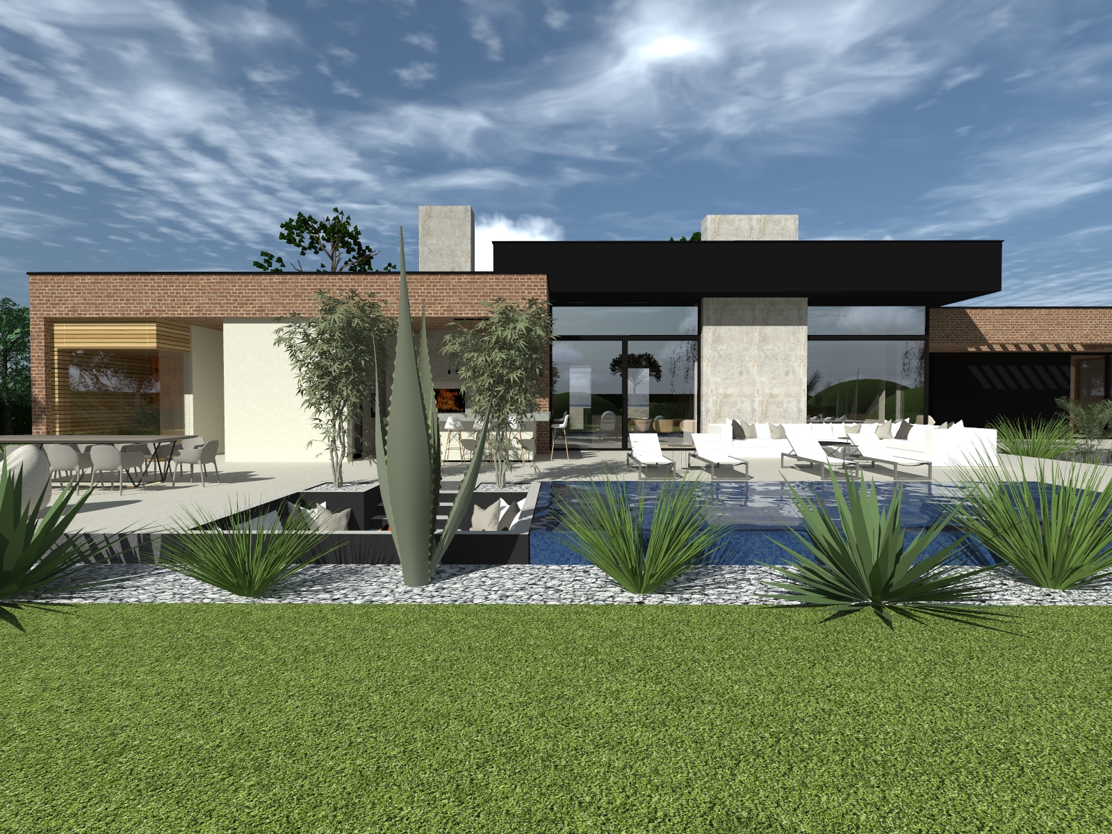 exterior shot enhance the plants enhance the trees enhance the grass enhance the textures of the materials architecture