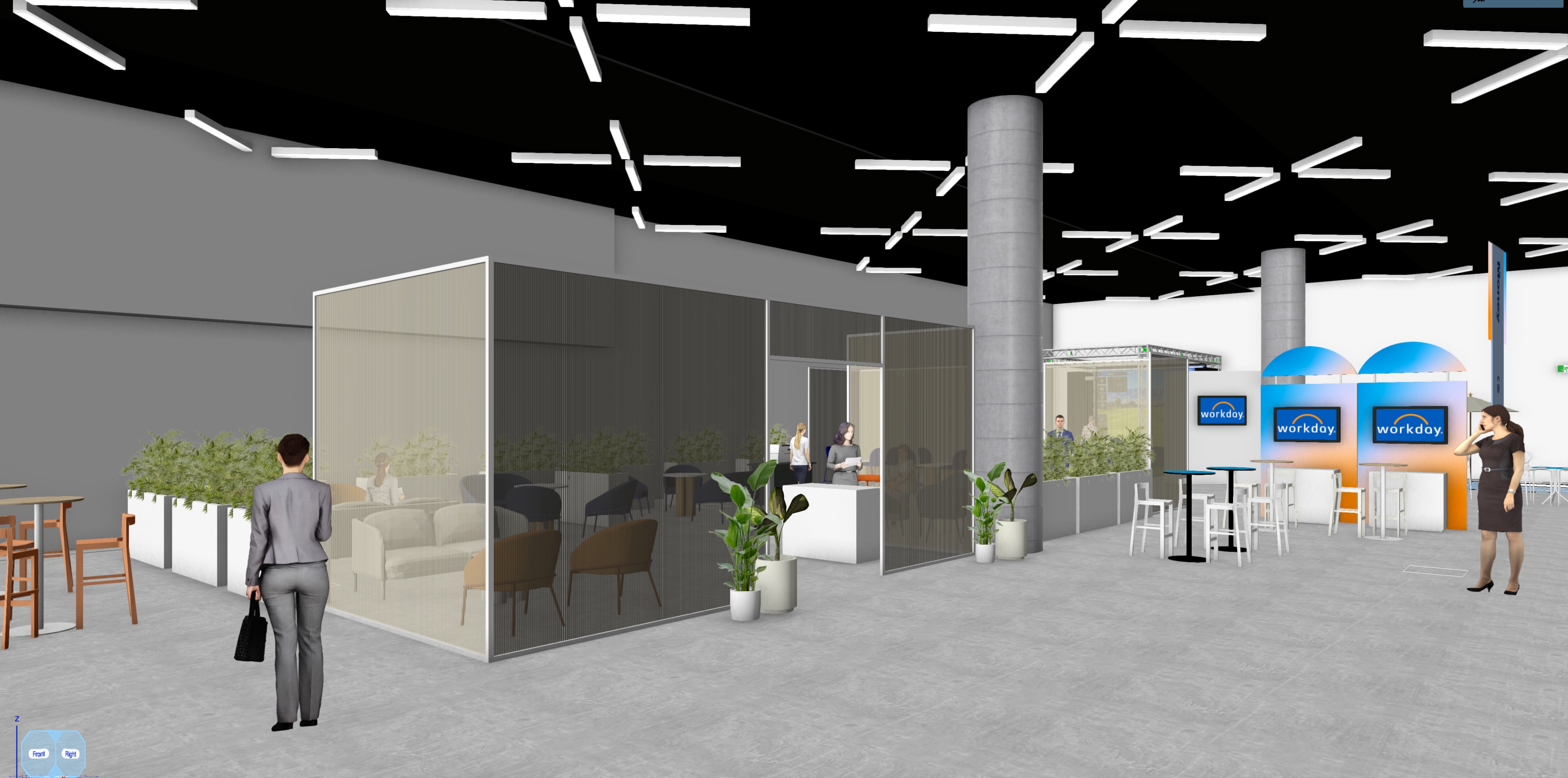 a modern exhibition hall business people walking around the room and seating on furniture soft medium lights spaghetti curtain with blue soft spotlight