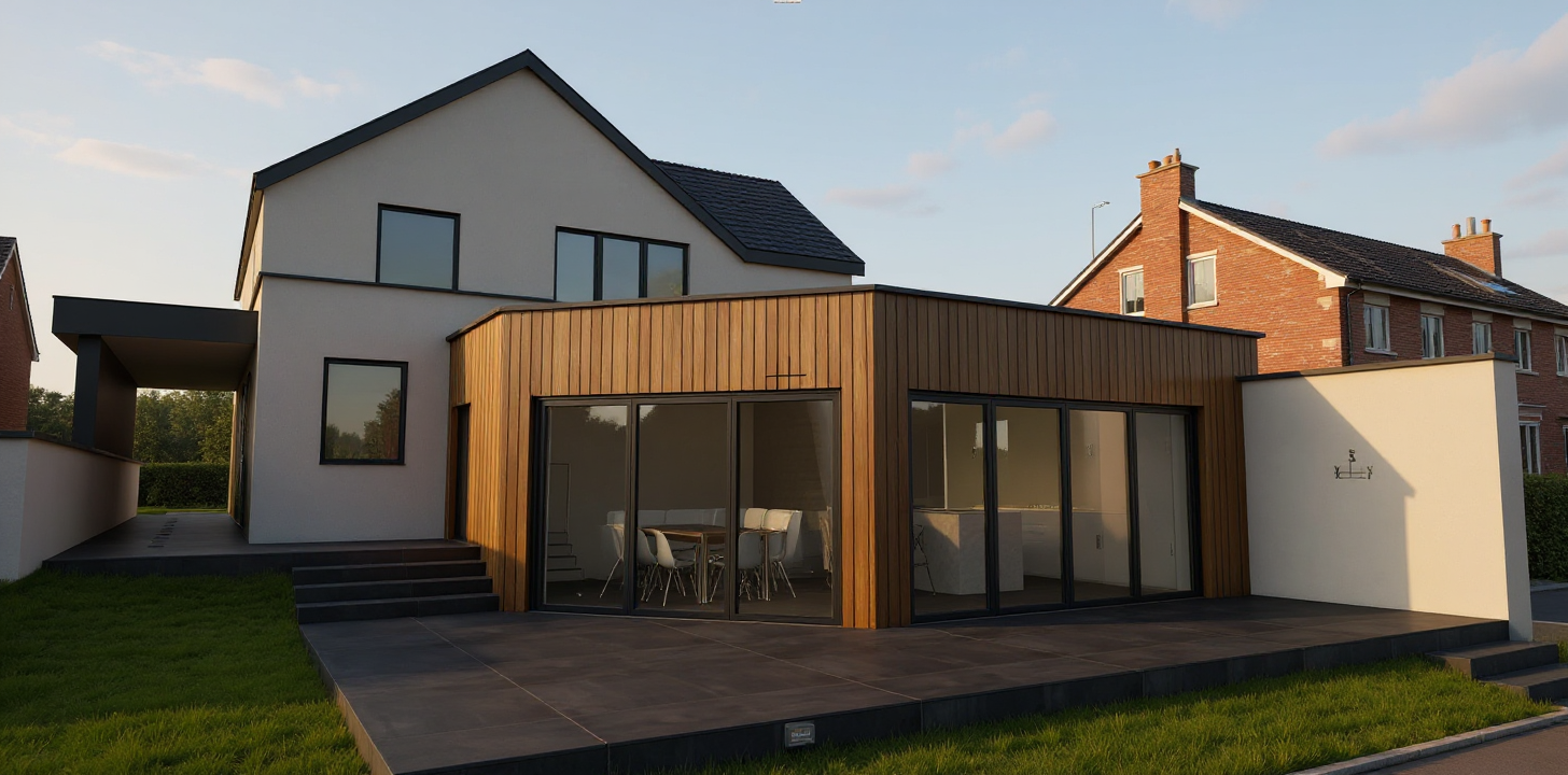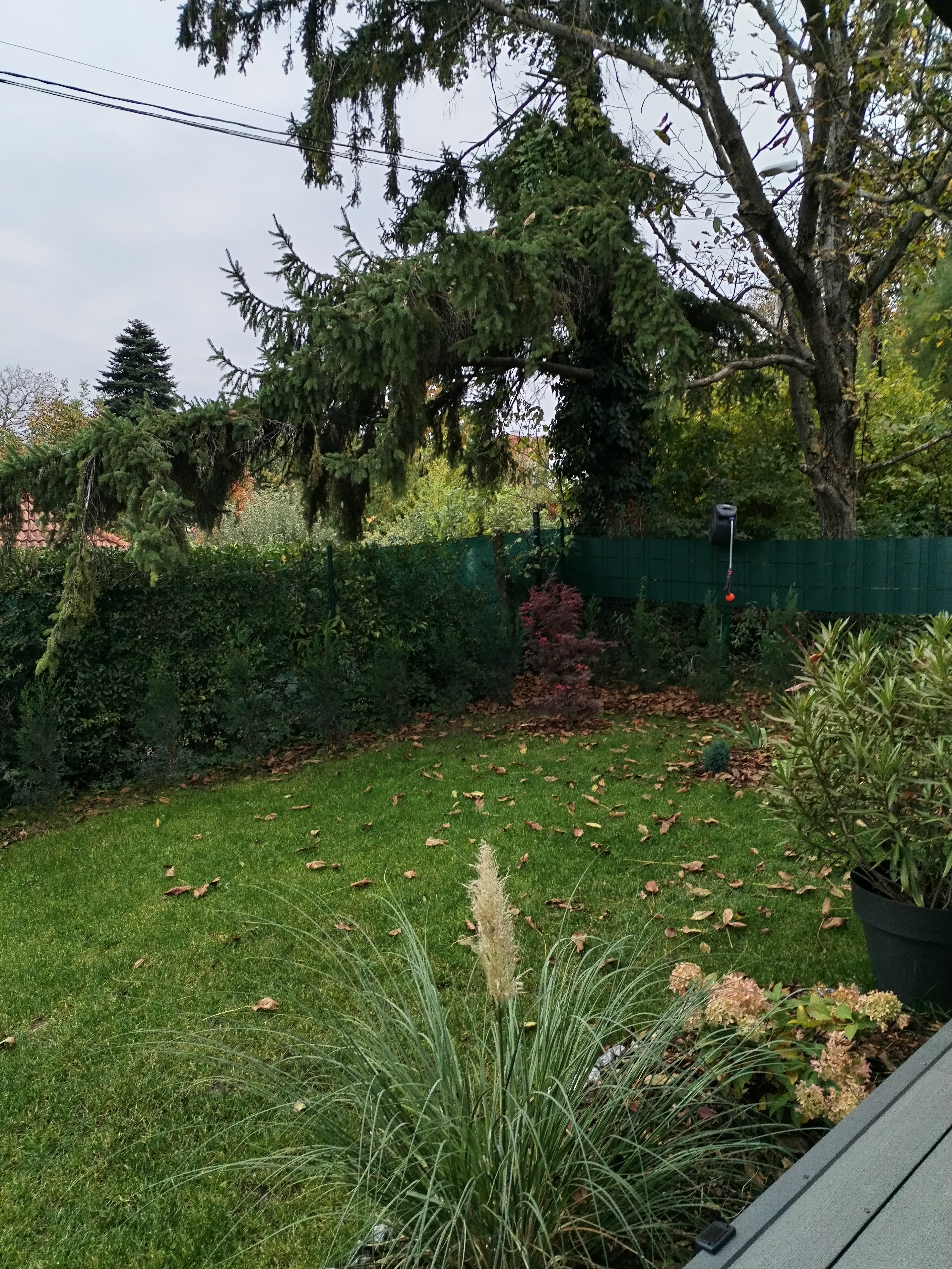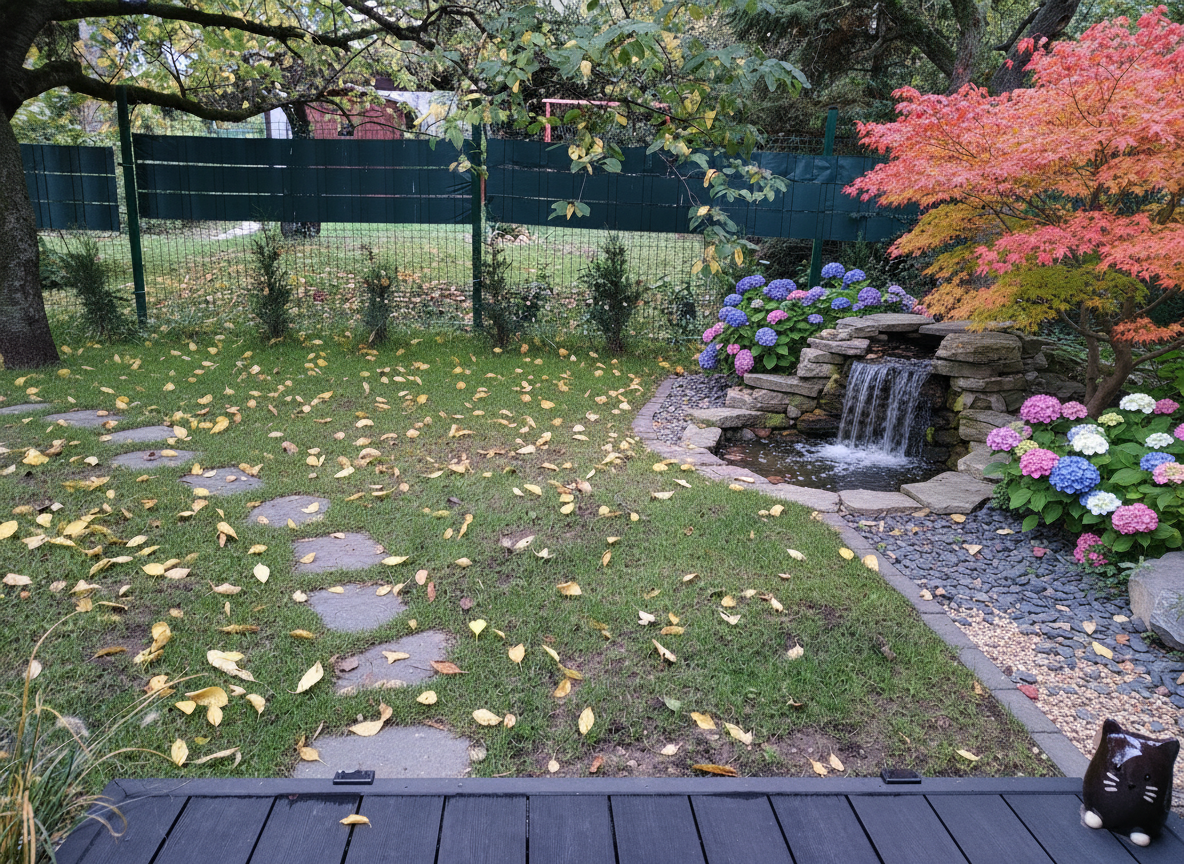 please show a cozy japanese garden in front of the fence with a small waterfall flowing between stones japanese maples and beautiful colorful hydrangeas there should be a green and gravel part with a small stone path leading to the japanese garden do not put a pond in it the japanese garden should not fill the entire garden it should be friendly and peaceful