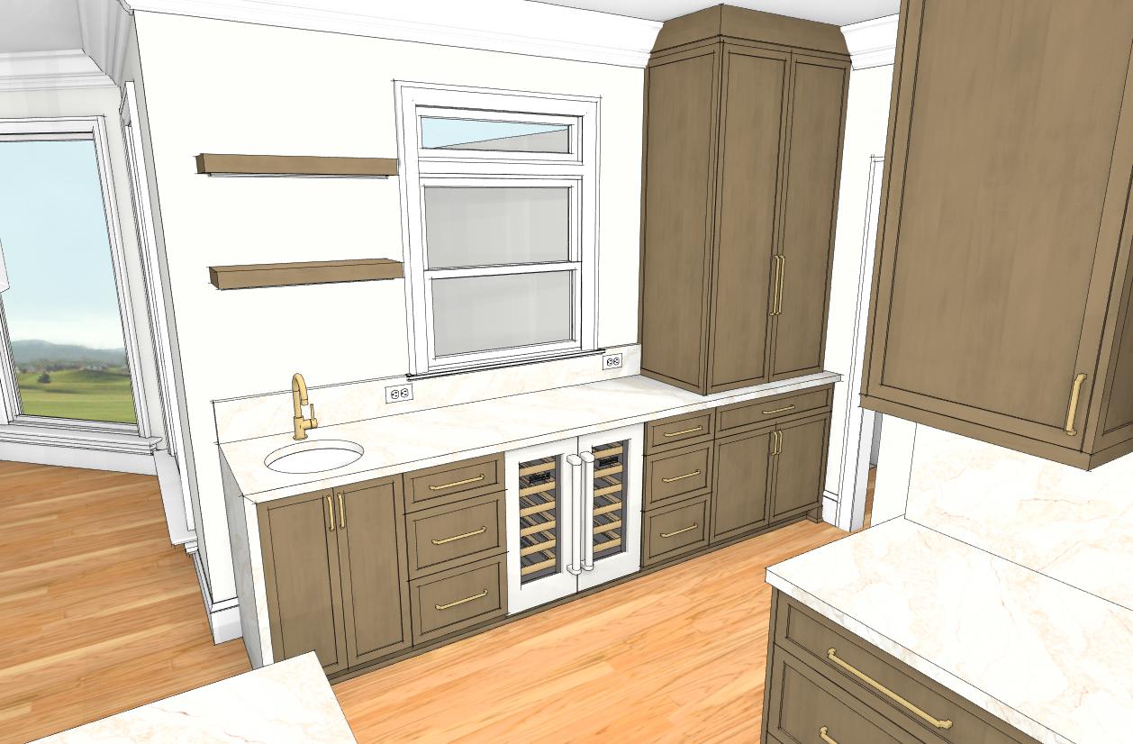 add kitchen accessories and daylight from windows add ambient light coming from under wall cabinets open shelves and under countertop of island do not put a sink under the window