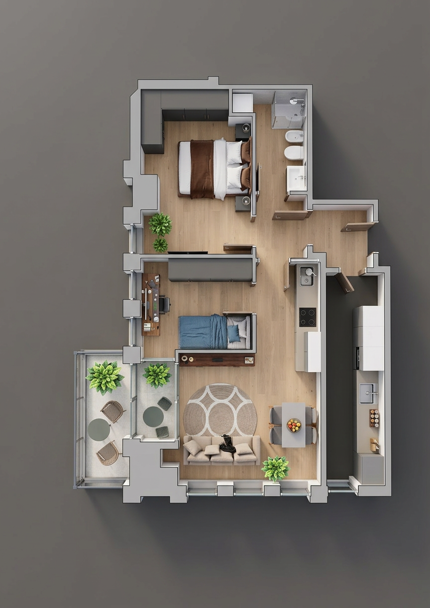 make a photorealtic render with the same materials make the red block a minimalistic painting but no red dont put in windows add some minimalistic hanging light above the kitchen island