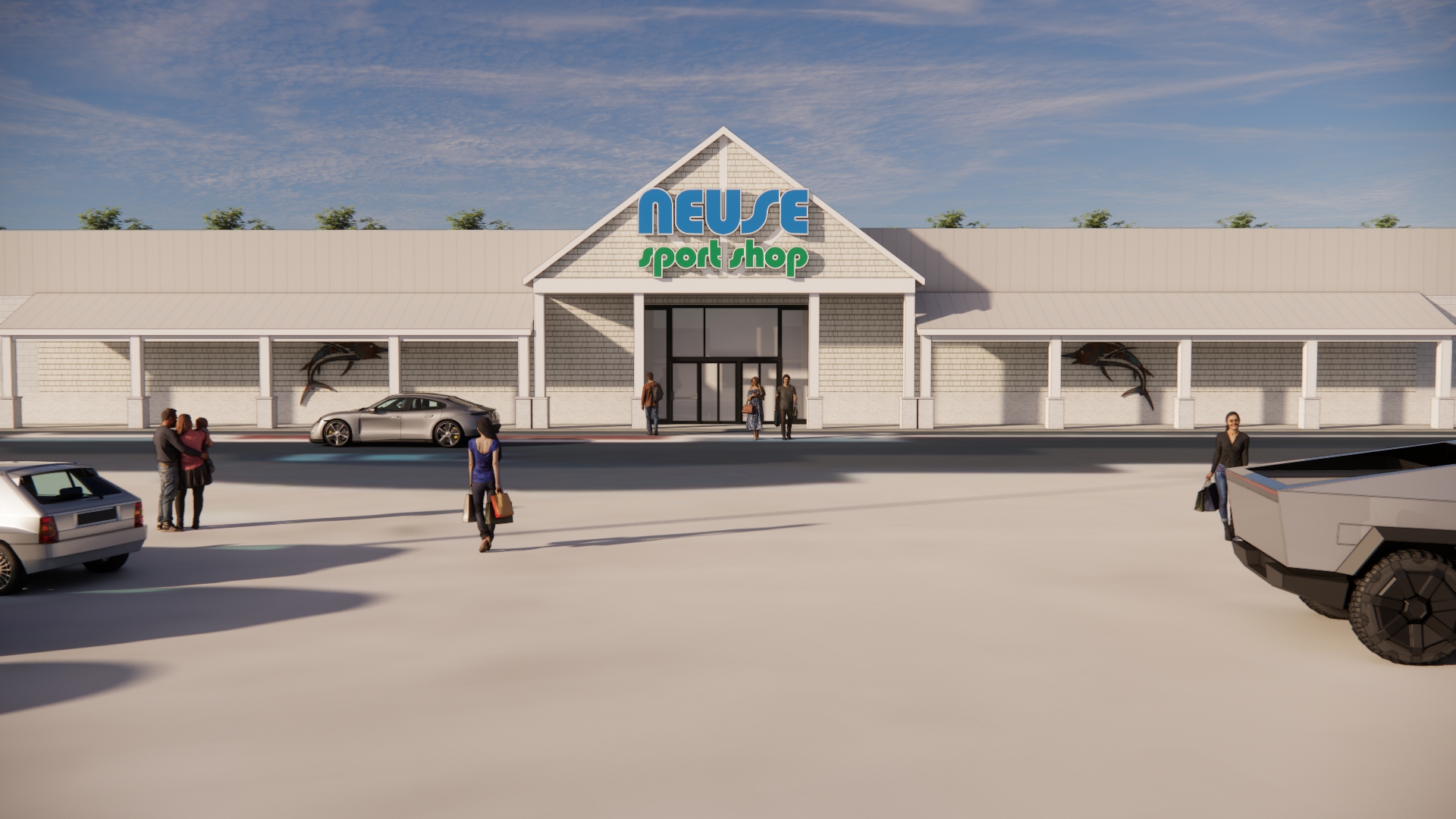 a modern sport shop exterior with a welcoming atmosphere the building features warm natural wood paneling in rich amber tones contrasted with sleek gray metal accents the shop s logo is bold featuring bright blue and green colors for a vibrant and energetic feel the sky is clear with a serene light blue color dotted with soft white clouds the paved area in front is smooth and light gray showcasing a few silver cars parked neatly tall lush green trees line the background enhancing the peaceful and friendly environment the scene is lit with soft natural daylight casting gentle shadows creating a calm and inviting atmosphere add christmas lights around the roof line make night time