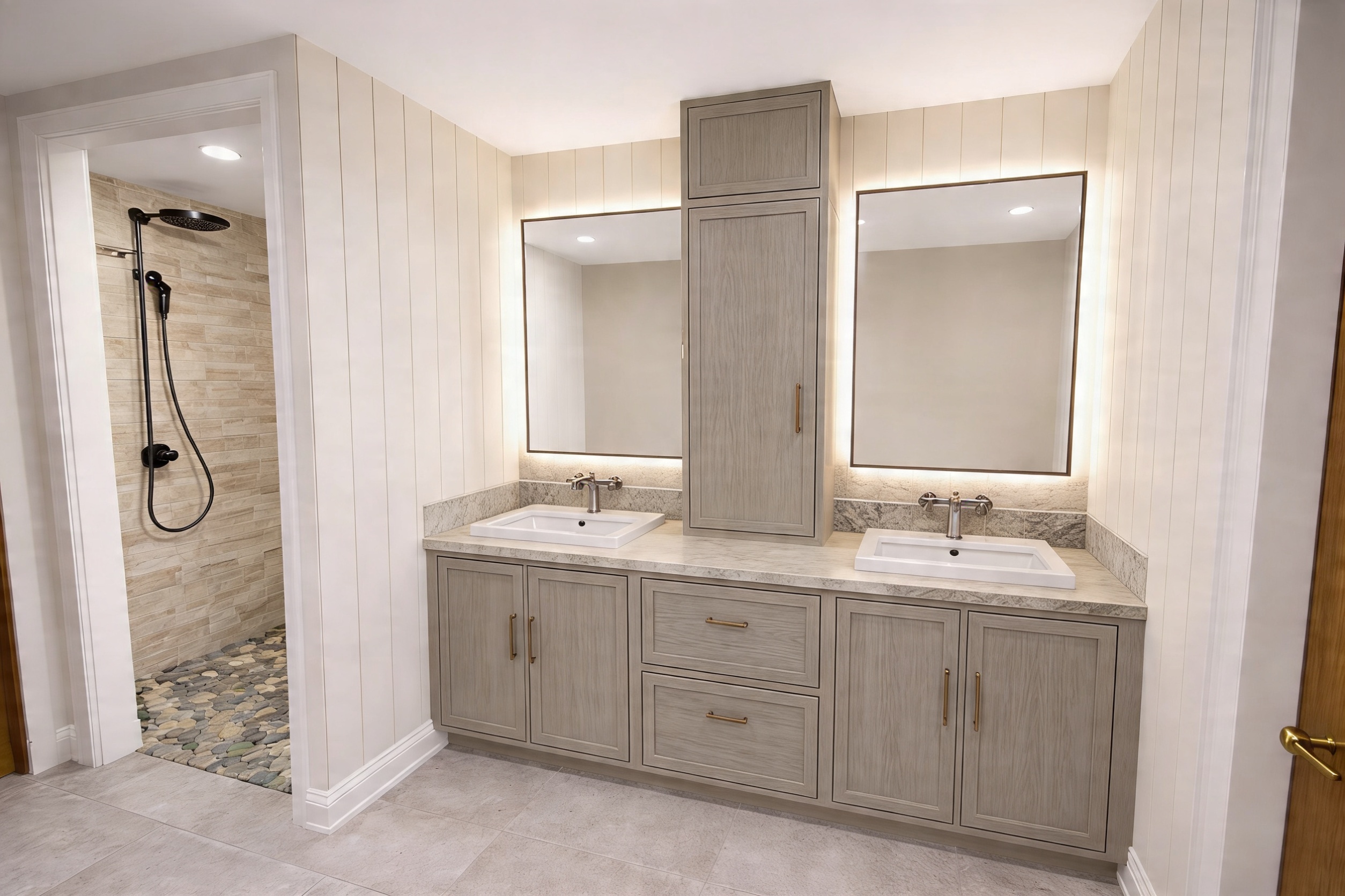 use this image as the base keep everything identical all materials colors cabinetry countertops hood hardware lighting and architectural elements remain exactly as shown only add the styling below coffee nook left corner recessed bay in the small recessed alcove on the left wall style a minimal coffee nook on the existing counter surface place one compact modern espresso machine in matte black or brushed stainless a small stack of two ceramic espresso cups with saucers in cream a minimal matte ceramic canister and one small trailing plant in a simple ceramic pot clean and editorial not cluttered island styling one medium leafy green plant in a minimal stone or ceramic pot one ceramic fruit bowl with mixed seasonal fruit and one linen covered hardcover cookbook lying flat nothing else on the island open shelving left wall add one small trailing green plant in a matte ceramic pot one linen covered cookbook lying flat and one minimal matte ceramic vessel clean and intentional do not change any materials colors or architectural elements do not add pendant lighting only add the styling described above
