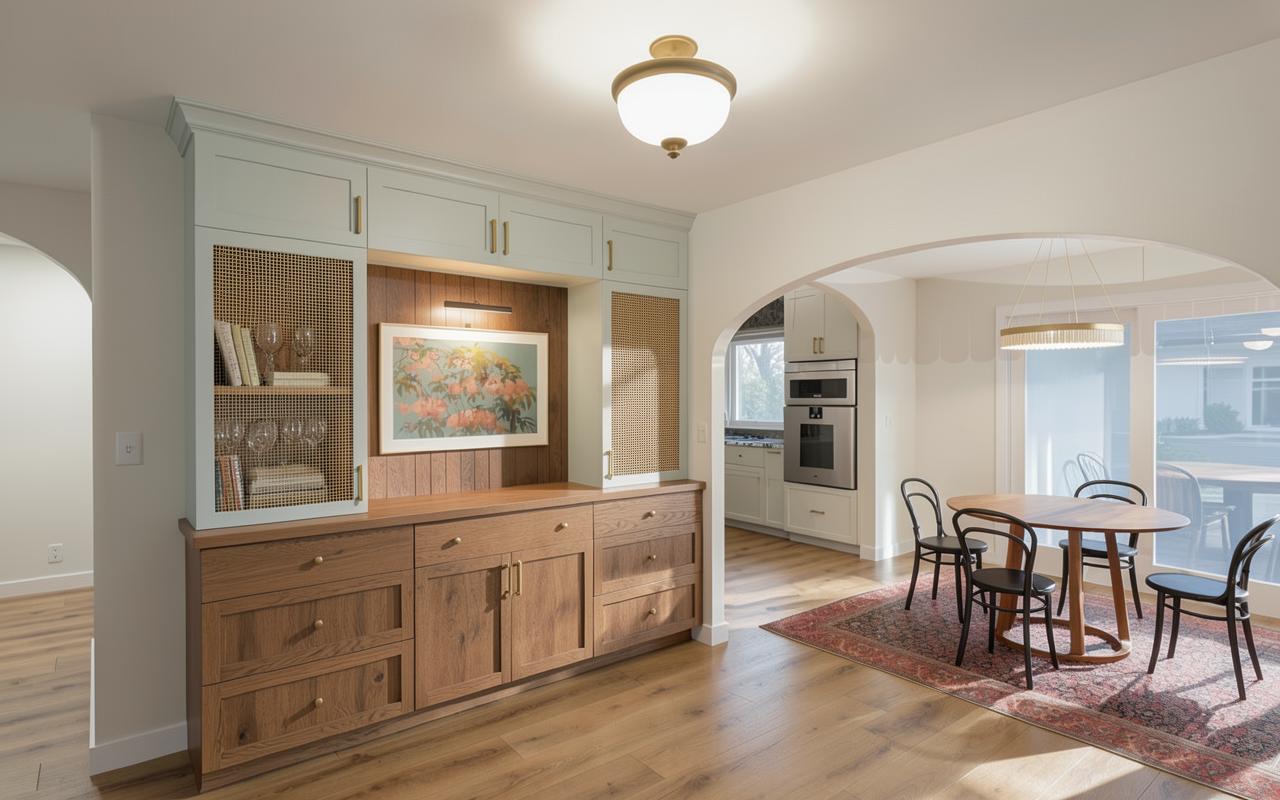 this a small modern tiny home this perspective is shooting from the kitchen and showing the pocket door entrance to a small bathroom the cabinetry and stairs above the refrigerator should be made of walnut planks lighting is golden hour