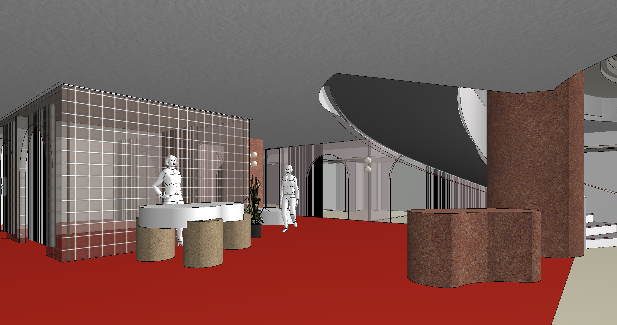 light dusty pink glass brick wall behind table change white table top to silver mirror show the legs as rammed earth finish show the red floor as white tiled terrazzo tile with large coloured stone accents show the staircase in white show the columns and table next to column in dusty textured red terracotta show the consult rooms with arch entry in a light dusty pink transparent finish with white curtains