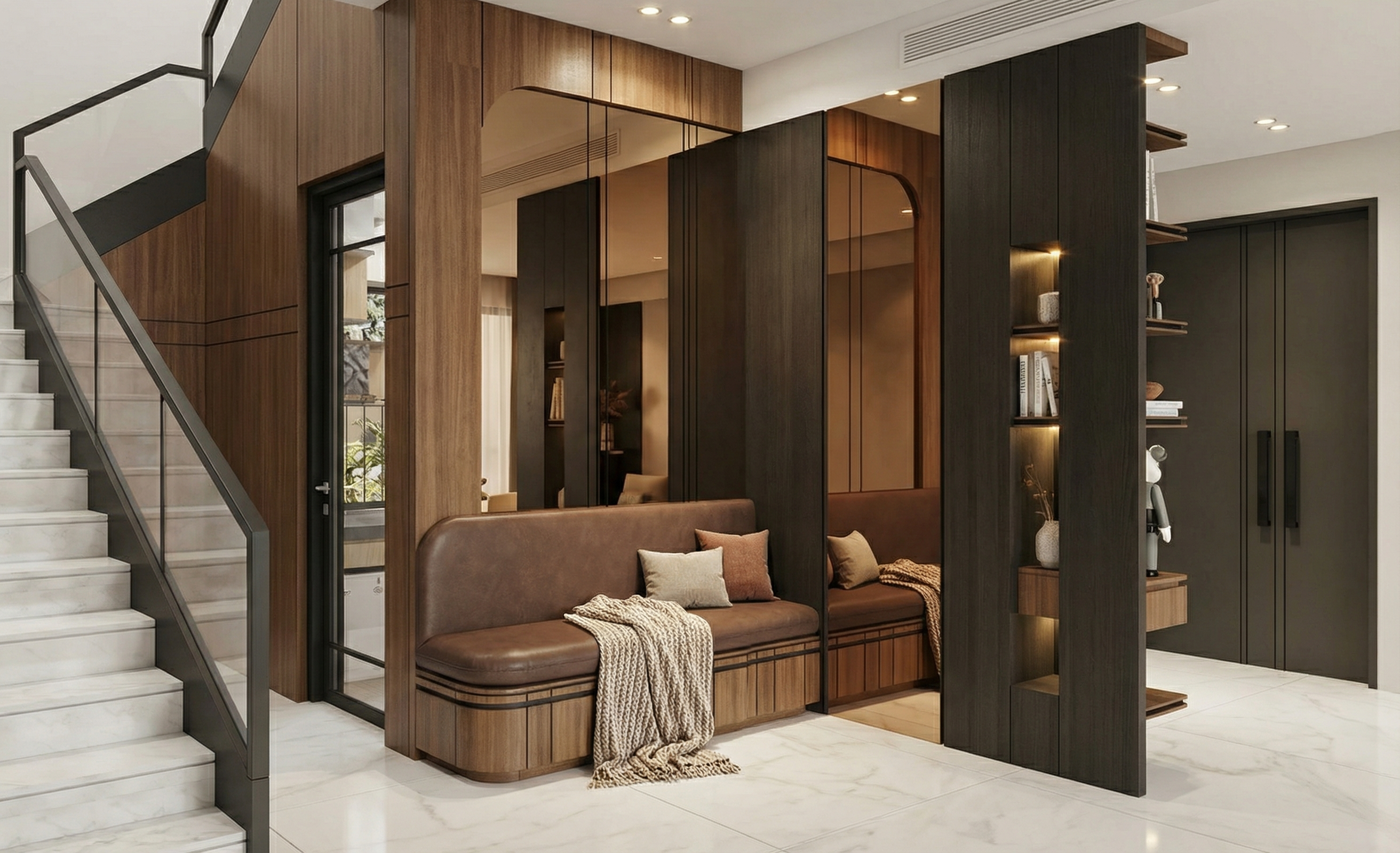 soft light beautiful entrance the reflection in the mirror is the kitchen