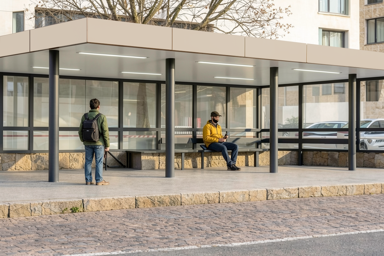change only the color of the shelter s ceiling underside in the architectural visualization to ral 080 80 10 exactly matching the cornice r mse do not alter the cornice or any other elements roof columns windows shadows lighting textures must remain exactly as in the original image with no changes in color brightness or tone ensure the ceiling blends naturally and photorealistically while keeping all materials shading and reflections consistent the final result should be fully cohesive with no visible edits outside the ceiling