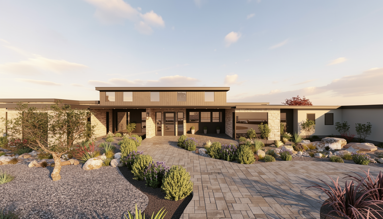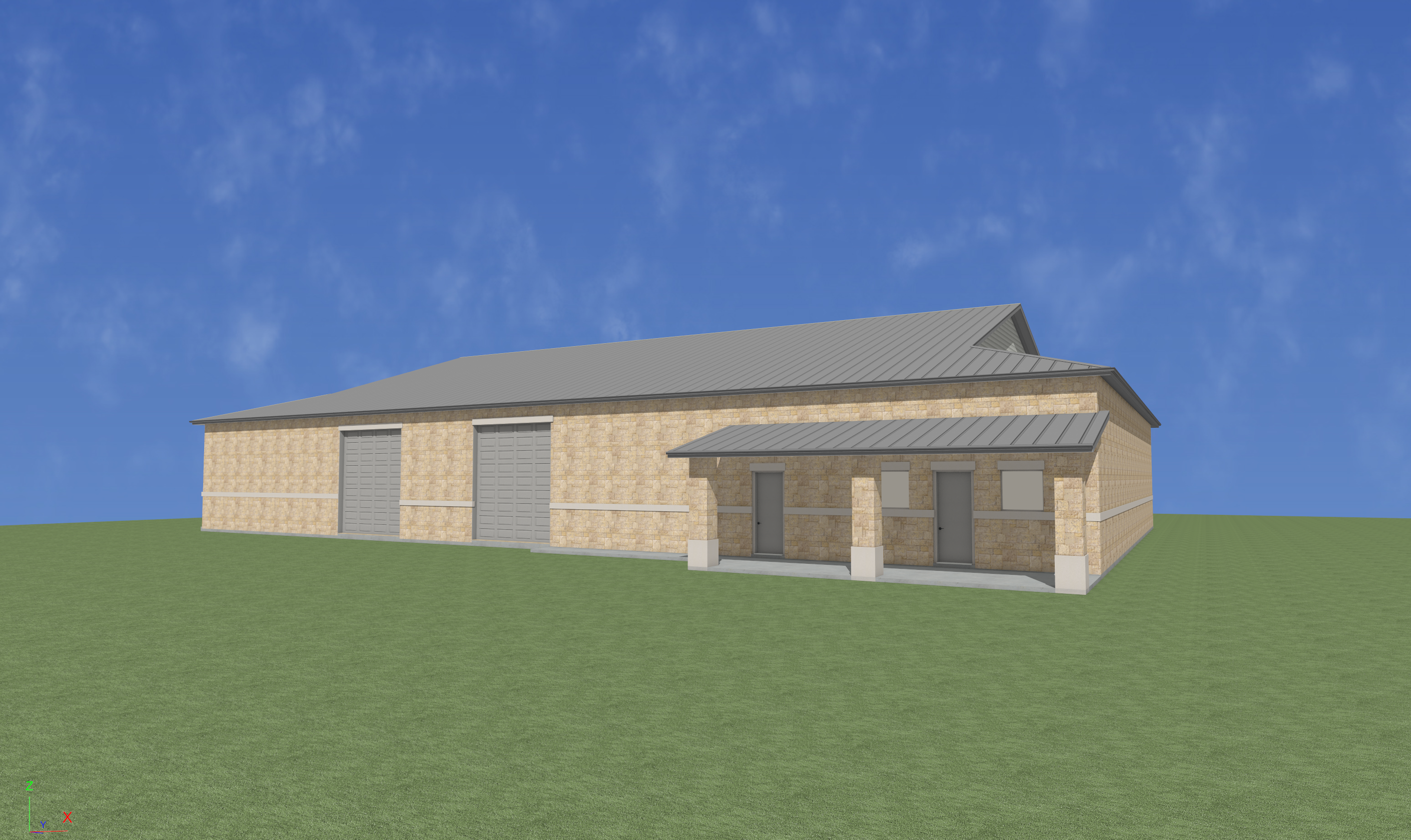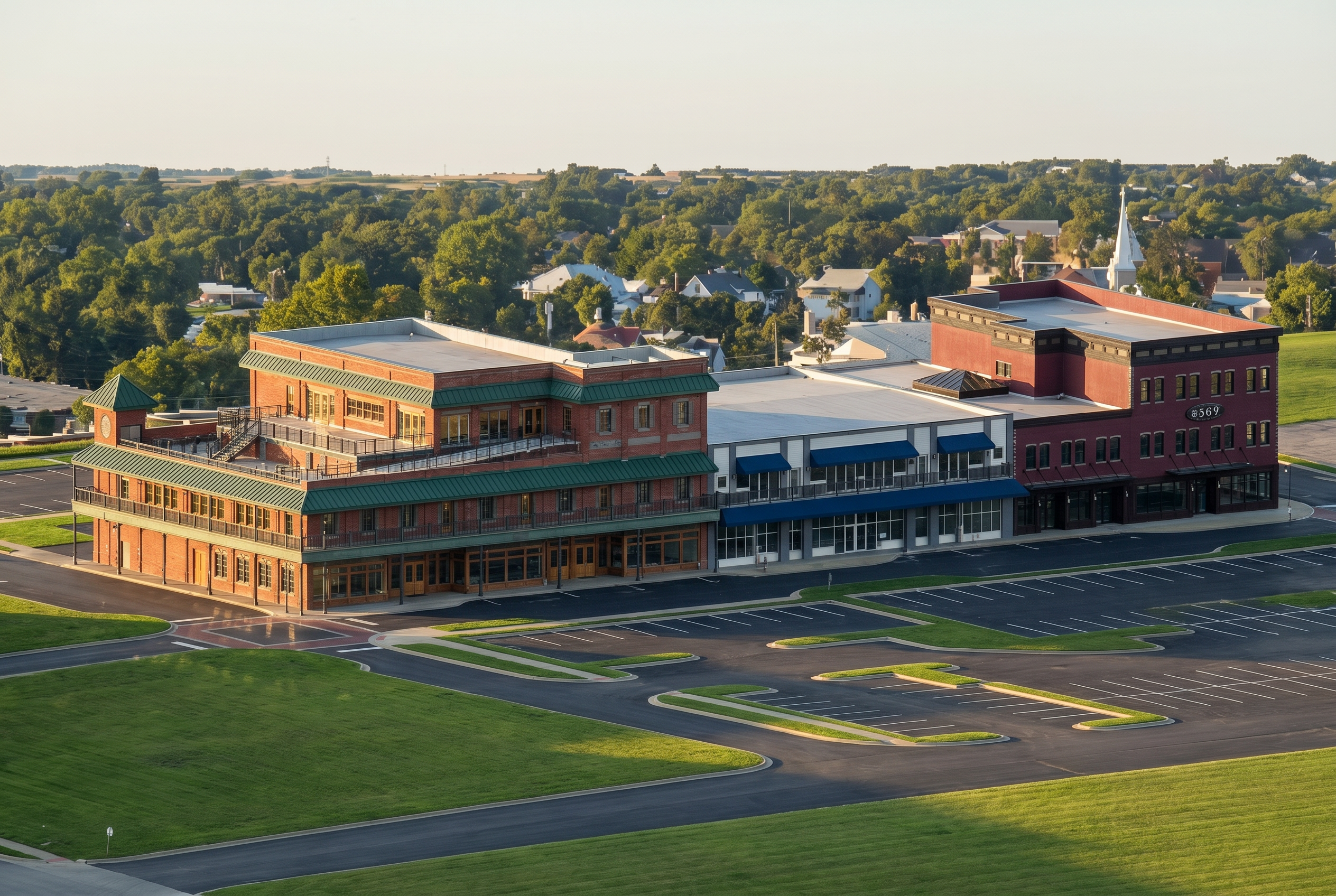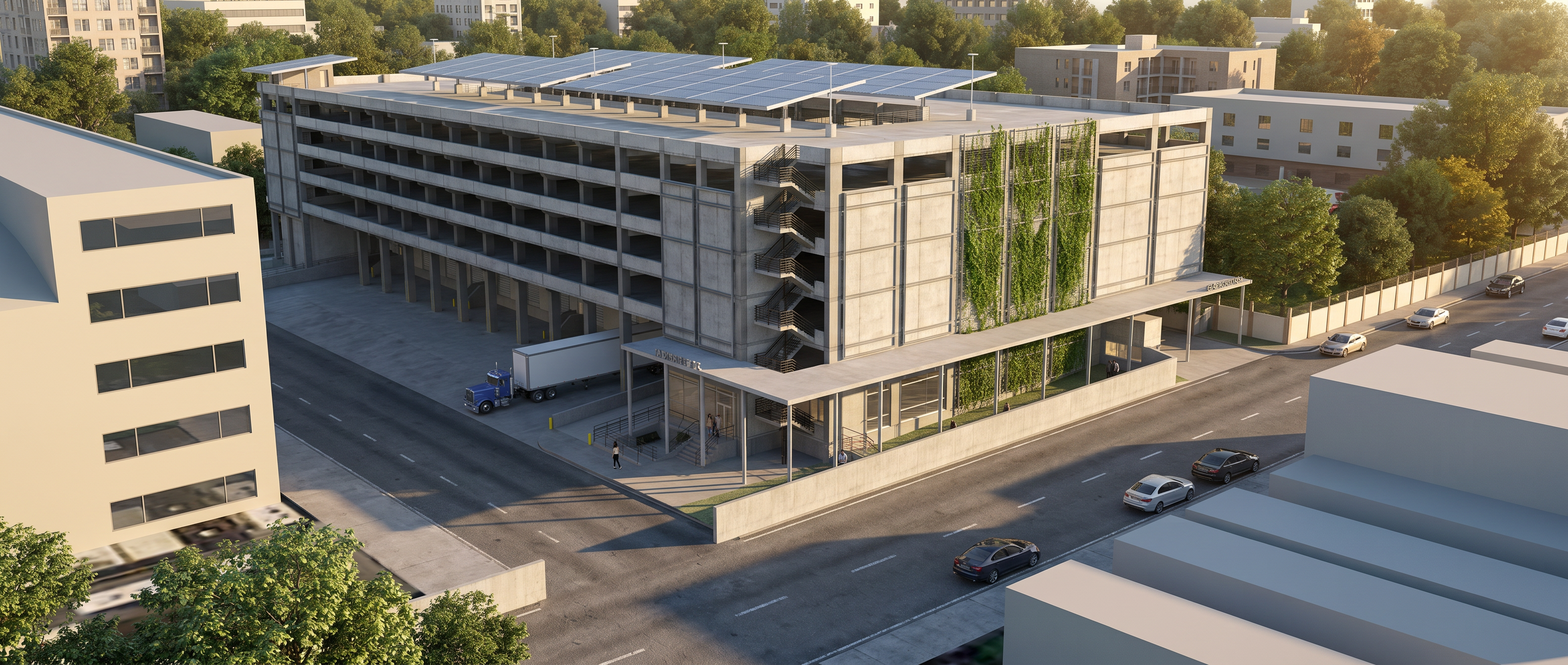 3d photorealistic rendering of the building view in image 1 add parking with cars landscaping around the building semi truck backing up to the farthest overhead door on the left no cars around the semi truck loading area add trees in the background