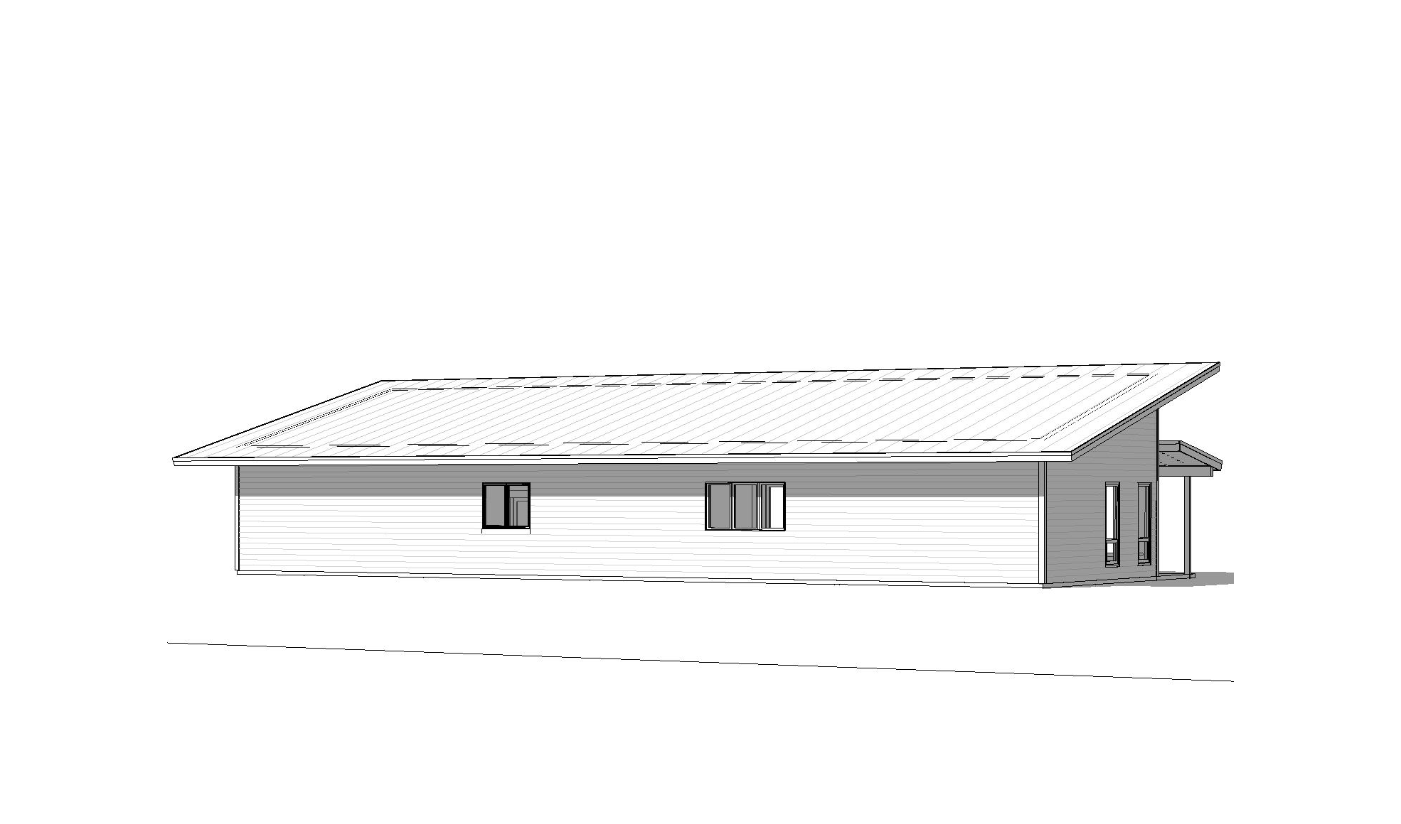 clean modern barndominium architectural exterior home rendered in cinematic vibrant dusk lighting with blue skies and vibrant clouds barndominium in a lush beautiful mountain setting with green grass and dense trees surrounding the property warm glow and reflections off of the windows select grade vertical white hardie siding green manicured landscape around structure with gardens and patches of grass black standing seam metal roof high fidelity photorealistic visualization crisp shadow falloff refined facade geometry soft atmospheric depth premium architectural photography mood ultra clean composition and materials photorealistic render black trim around the windows and doors prominent trees scattered around the property black window trim and posts
