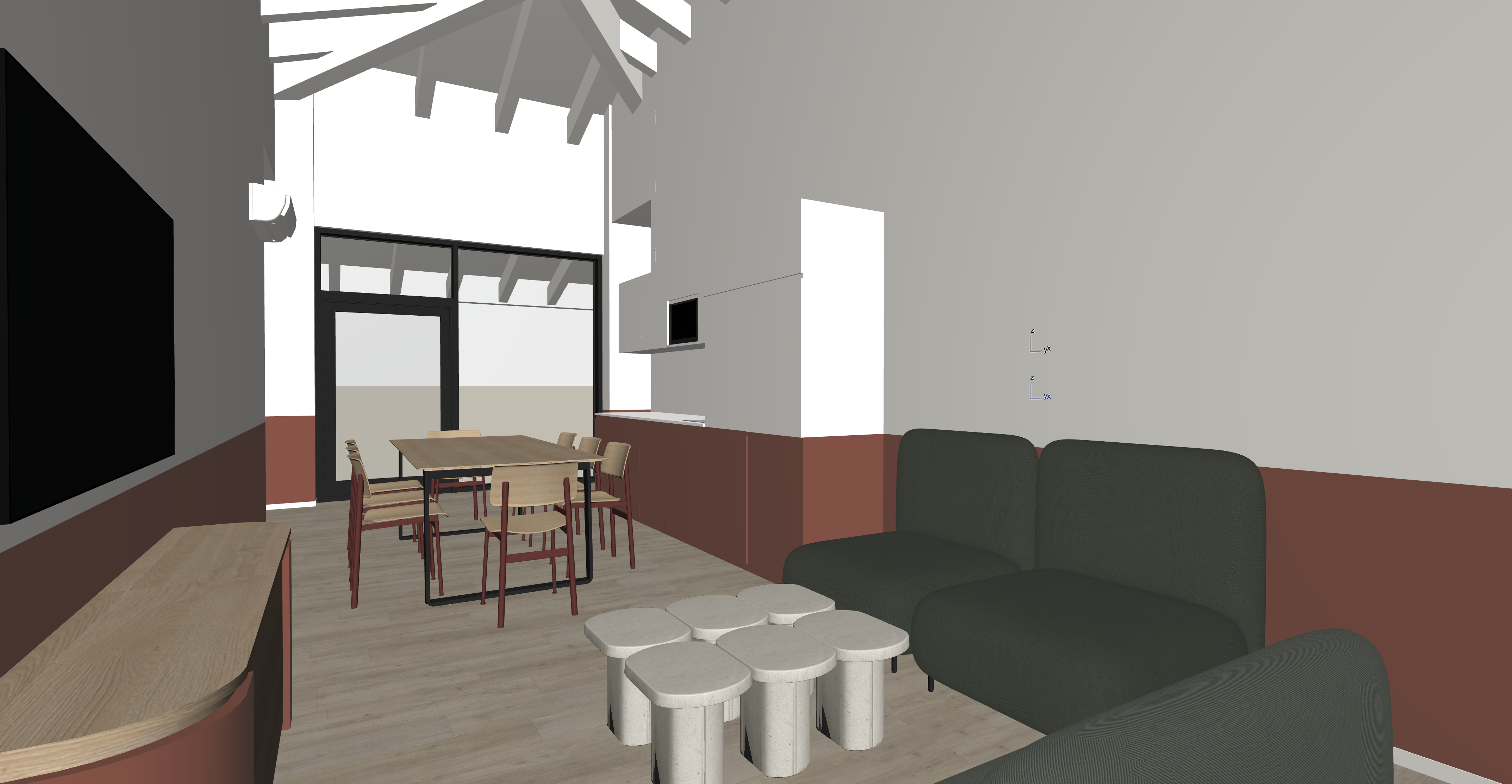 soffitto in legno rovere sbiancato nascondi esterno ma fai entrare luce naturale divano in tessuto verde molto scuro inserisci strip led sotto pensili cucina arreda la stanza come uno studente universitario no poster alle pareti mantieni color terracotta