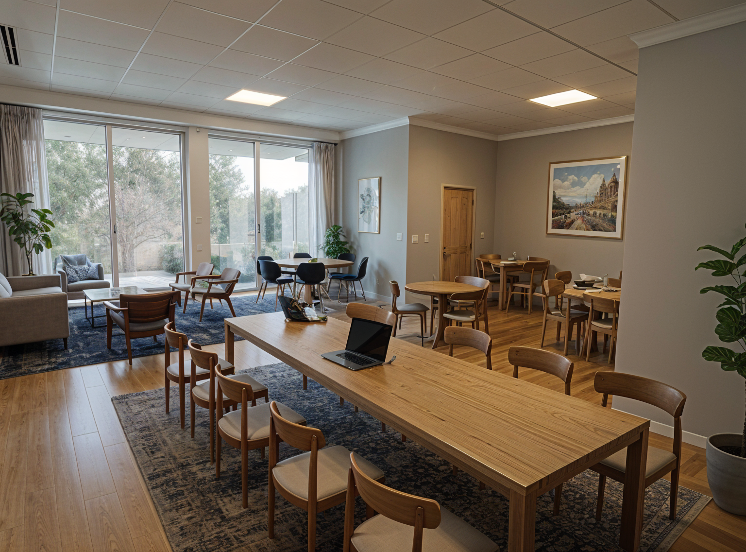 make it more photo realsitic and cozy make it brighter but keepmtha laypout and the placement of the furniture keep the carpet as it is the entrance with walls to the top right are glass walls including the door outside is a road with lots of traffic keep the colors of the furniture please the rug should be beige