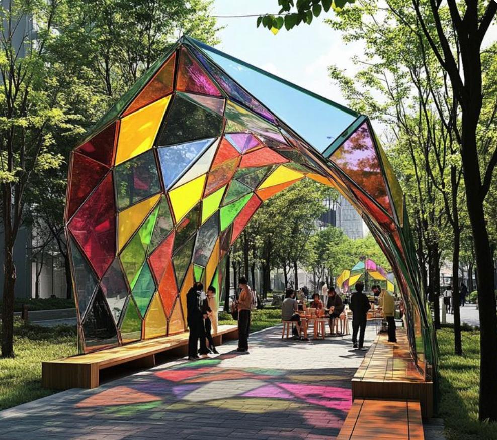 using the base image provided insert the stained glass structures from the reference image place these structures only in the areas marked in red on the base image ensure that the stained glass elements are scattered and have a semi transparent quality allowing some of the base image to show through the final composition should appear harmonious and integrated enhancing the overall aesthetic while preserving the original features of the base image