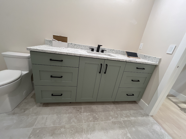 do not change the cabinets in any way preserve the exact cabinet colors materials finishes dimensions door and drawer styles hardware spacing alignment and all geometry exactly as shown do not alter the countertop shape backsplash appliances flooring lighting fixtures or wall structure only remove the construction materials clutter and mess from the scene clean the room and make it look finished and staged add a few simple tasteful home accessories appropriate for the style of the space but do not add or remove any furniture windows or architectural elements maintain the original lighting direction and realism enhance clarity and polish the photo while keeping the cabinetry and room design completely unchanged do not alter the lighting to keep the cabinet colors as they are in the image stage this as a beautiful serene bathroom with a mirror above the sink