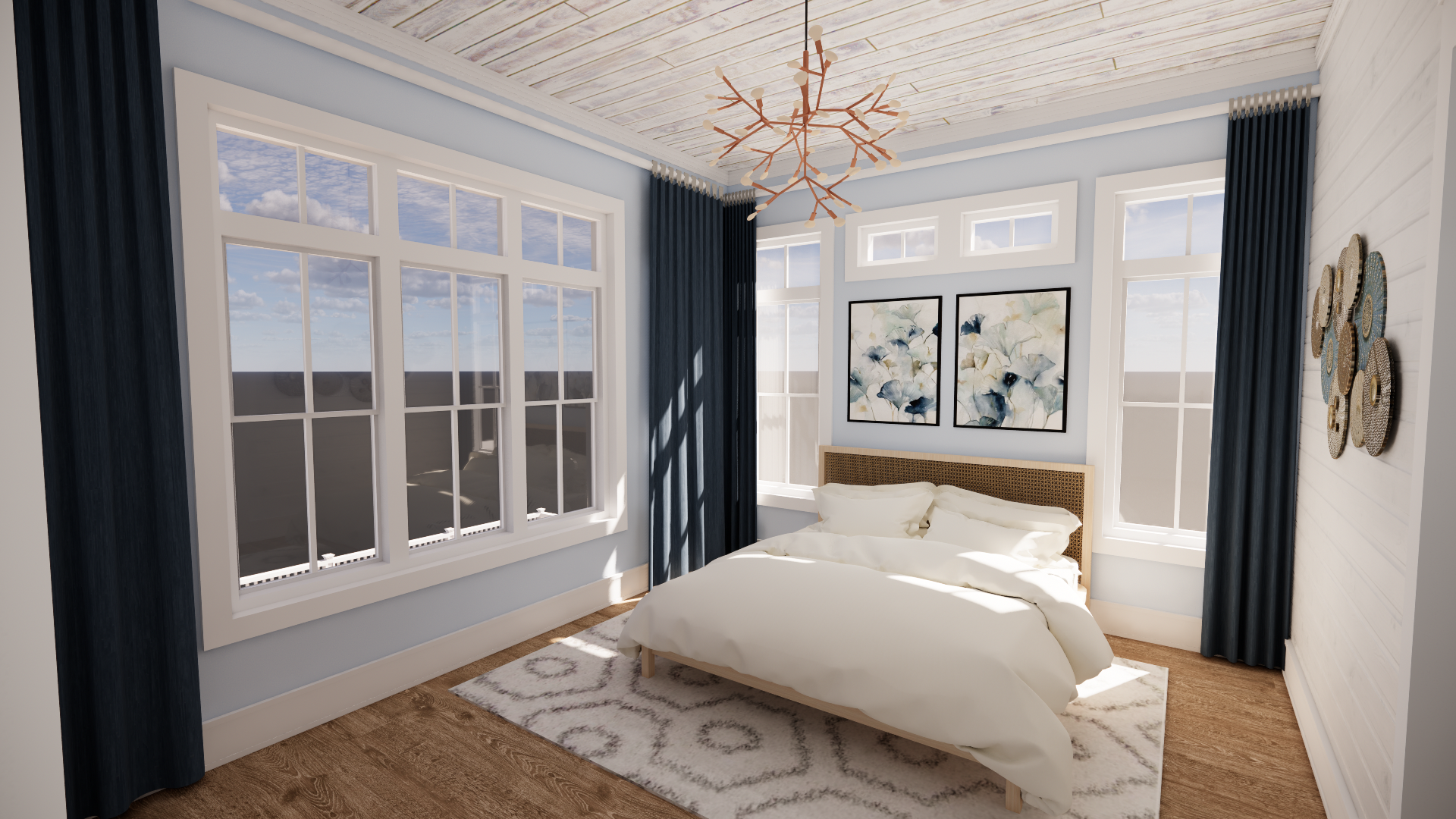 you are a professional image renderer you create the highest grade renderings around and specialize in architectural renderings this is an interior rendering of a second floor bedroom in a beach house create a high resolution photorealistic image of this room keep the windows as they are where they are keep the doors as they are where they are keep the main structure as it is where it is feel free to change the perspective keep the roofline as it is where is it do not add anything to the structure that i have not asked for the view outside the windows is the coastline it should be early afternoon with a bright sunny day clear skies